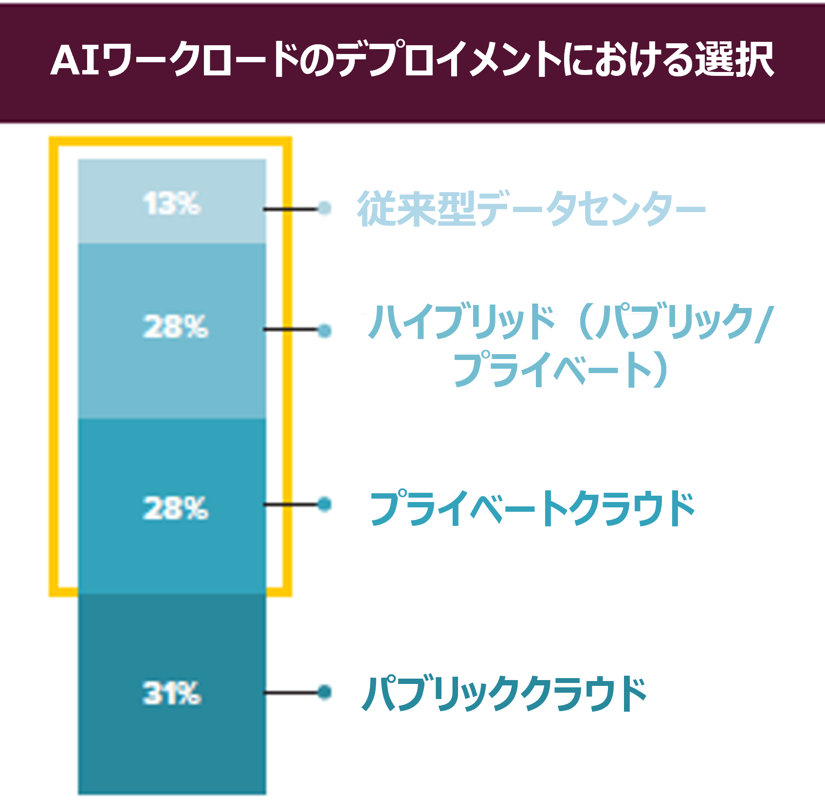 さらに、調査から明らかになった点として、アジア太平洋地域の企業は、AIワークロードのデプロイメントに関し、バランス重視のアプローチを採用する予定です。平均すると、AIワークロードの31%がパブリッククラウドに、28%はプライベートクラウドに、さらに28%はハイブリッドクラウドソリューションにデプロイされることになります。