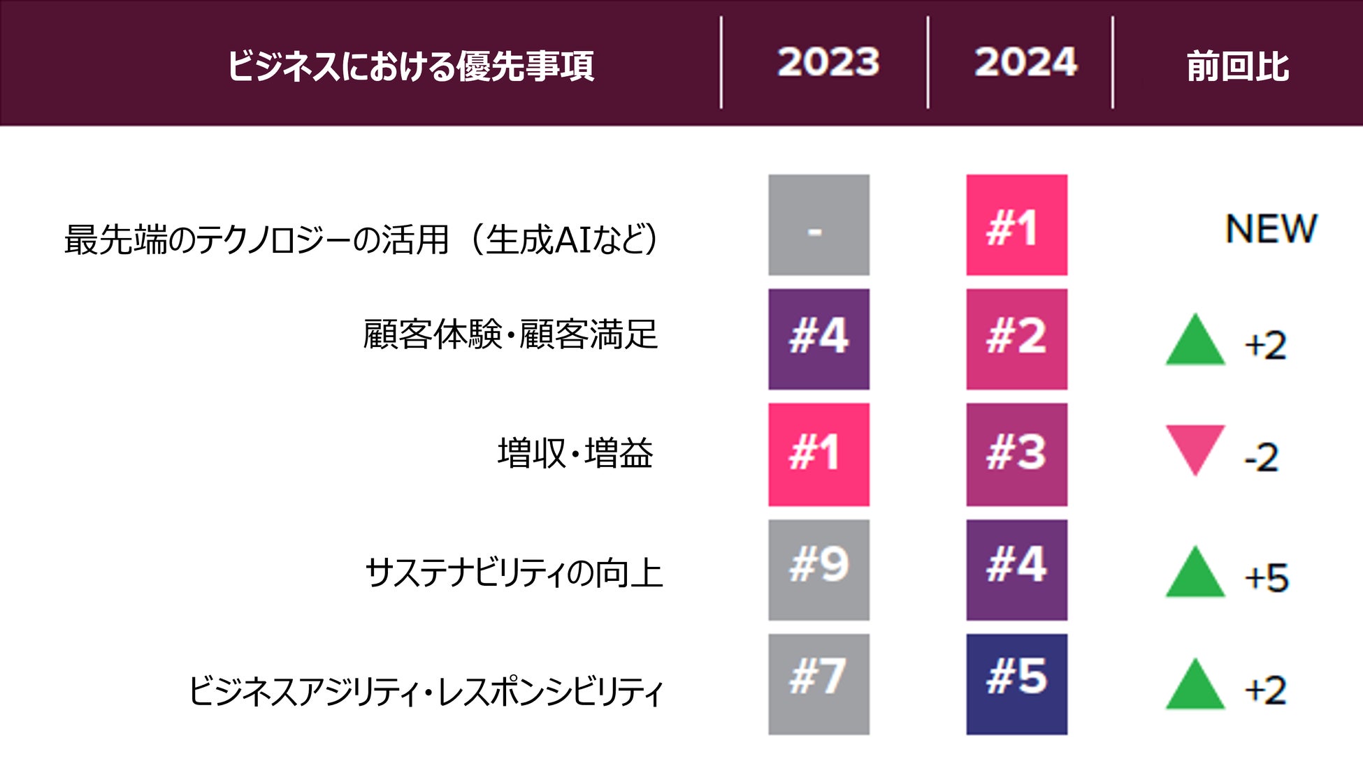 また、CIOの優先事項は昨年から大幅に入れ替わっており、AIは最上位にランクインしています。注目すべき点として、2023年に最優先事項だった増収・増益は2024年には第3位に下落し、顧客体験と顧客満足は、2つ順位を上げて第2位にランクインしました。このデータは、進化するビジネス環境の中で、最先端のイノベーションや顧客中心のアプローチに対する戦略的なシフトを明確に示すものです。
