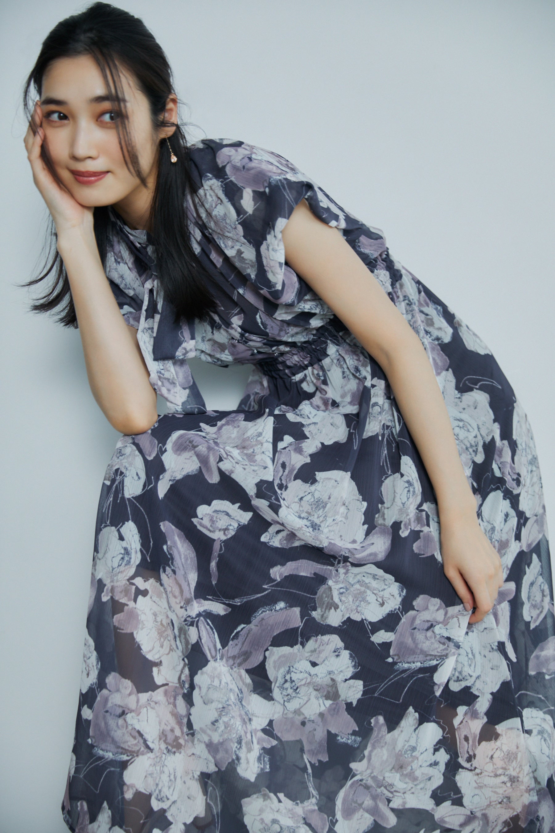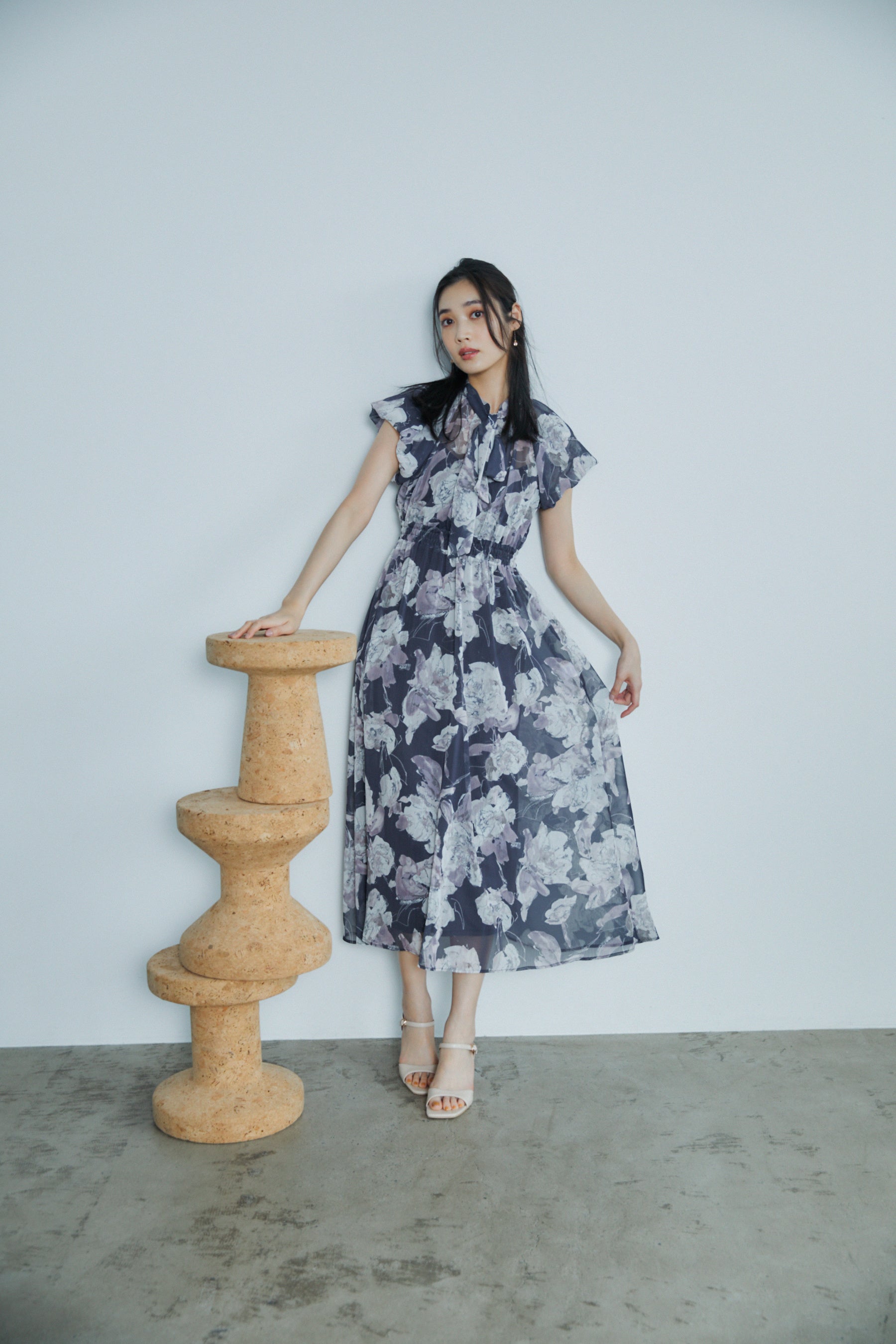 水彩画のようなぼかしフラワーが大人のフェミニンスタイルにマッチ。