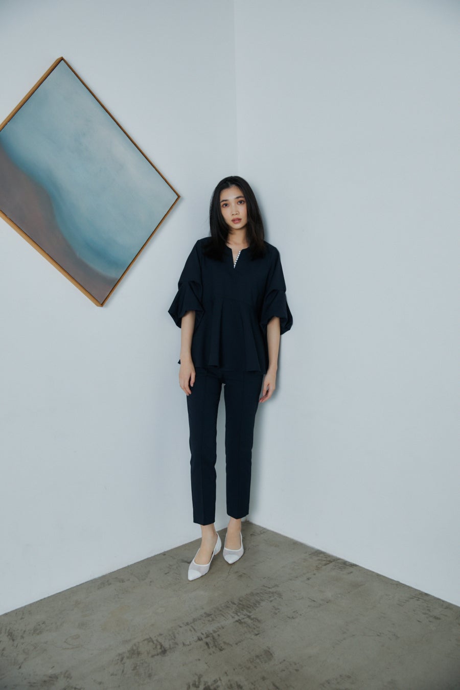 ノーブルなセットアップも、今年らしいペプラムシルエットで差をつけて。