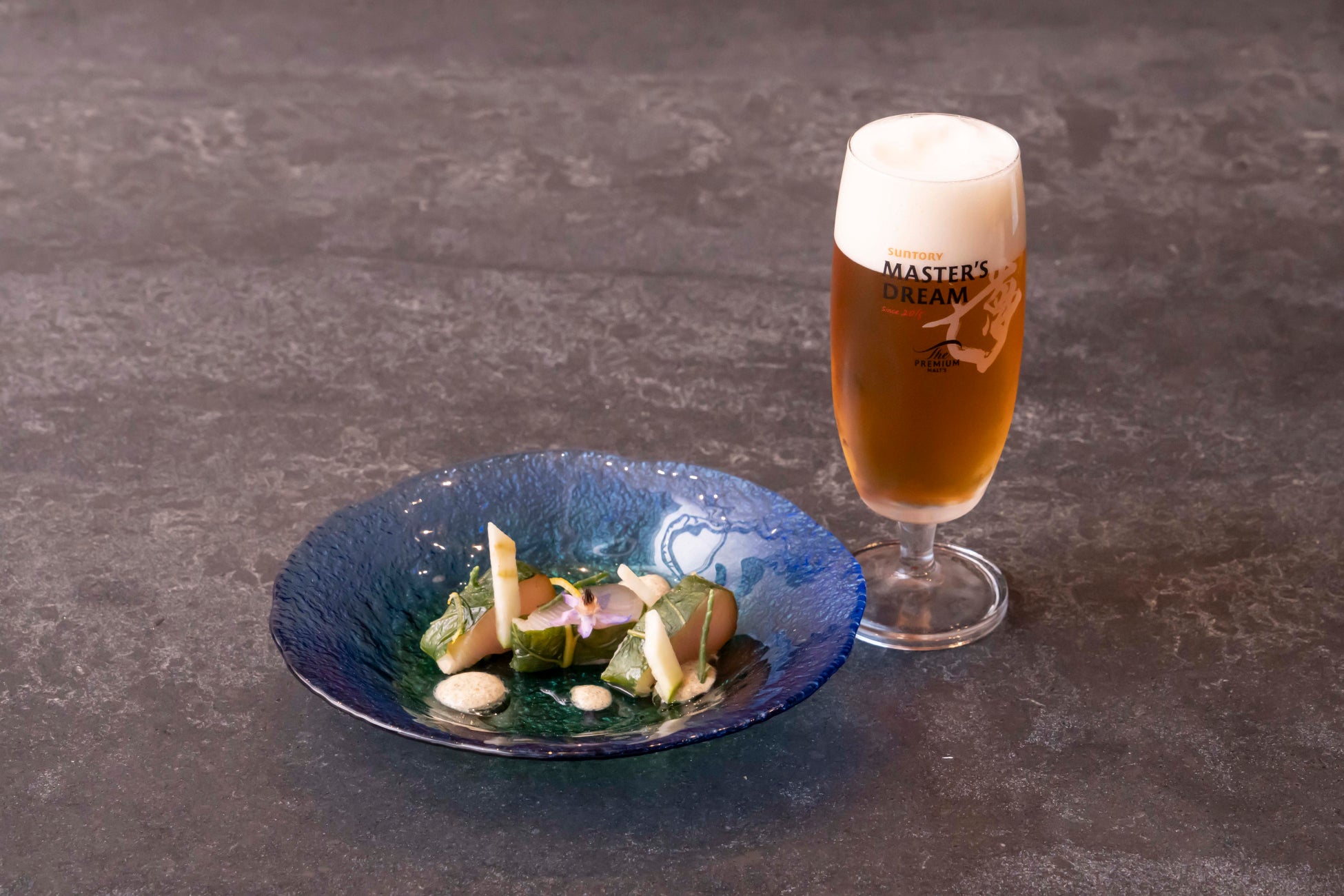 また、料理の合間には、サントリー株式会社 ビール商品開発研究部 部長・寺西健氏が登壇。特別演出として、11月11日(火)新発売となる「ザ・プレミアム・モルツ マスターズドリーム〈山崎原酒樽熟成〉2025」が発売を前に一足早く提供され、参加者は芳醇な香りと甘みと苦味の調和を存分に楽しみました。