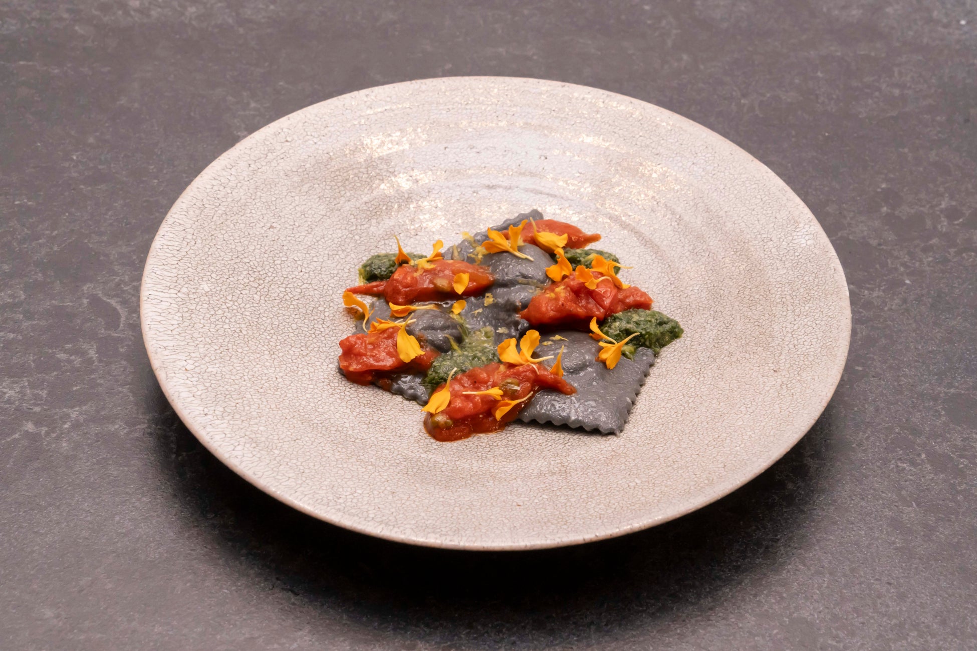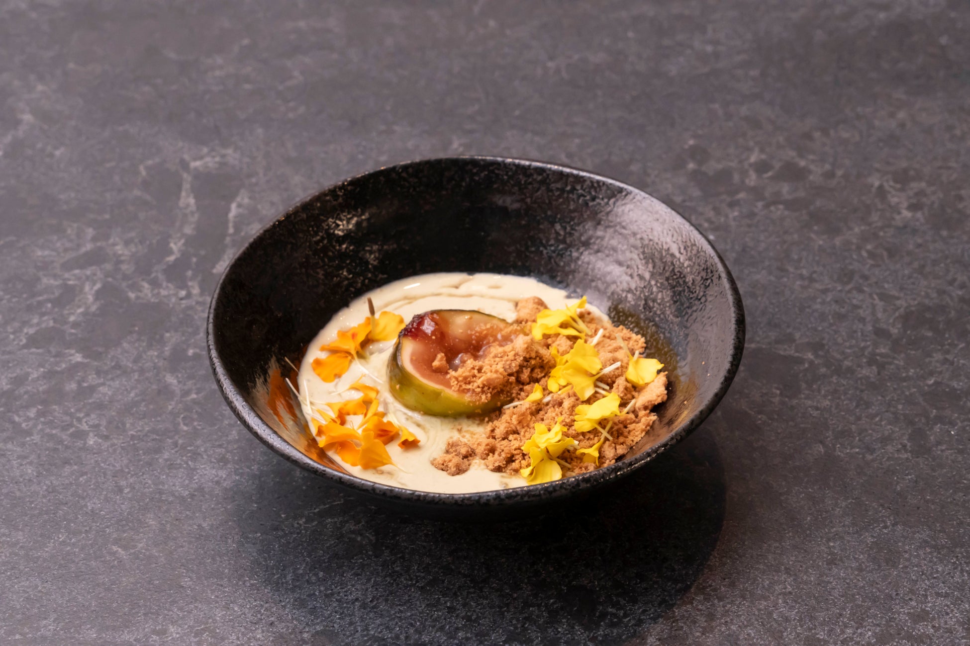 料理の後半では、イカスミのラビオリとズワイガニのブッタネスカが登場。メインにはエゾシカのお肉に季節の野菜と、ハスカップをはじめとした果実をあわせた一皿を提供しました。六品目のデザートの主役は、イチジク。味わいをより引き立たせるきな粉、イチジクの香りのアングレーズソースと共に登場しました。