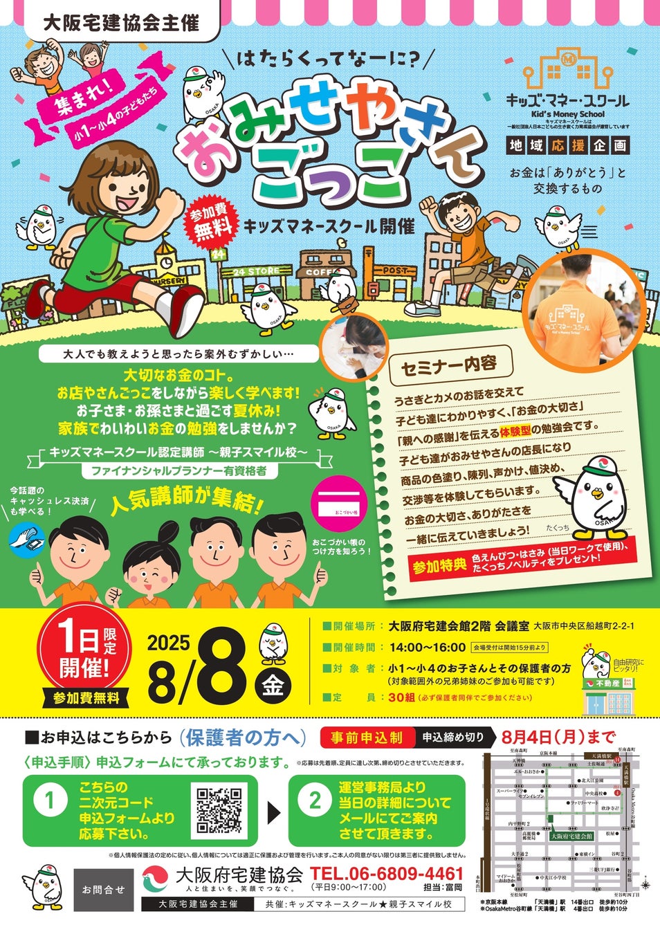 一般社団法人大阪府宅地建物取引業協会(所在地:大阪市中央区、会長 山本 清孝(以下、大阪宅建と言います。))の女性会員で構成する女性部会では、今年も小学生を対象とした地域貢献イベント「たくっちのキッズマネースクール2025」を開催いたします。