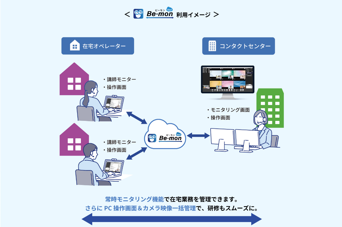 「Be-mon」は常時モニタリング機能や双方向コミュニケーション機能により、在宅コンタクトセンターを実現する上の課題であった「セキュリティ問題」や労務管理などの「マネジメント問題」「品質管理問題」まで解決し、従来のコンタクトセンター内での業務と遜色のない環境を、オペレーター、管理者双方に提供可能な画期的なシステムです。