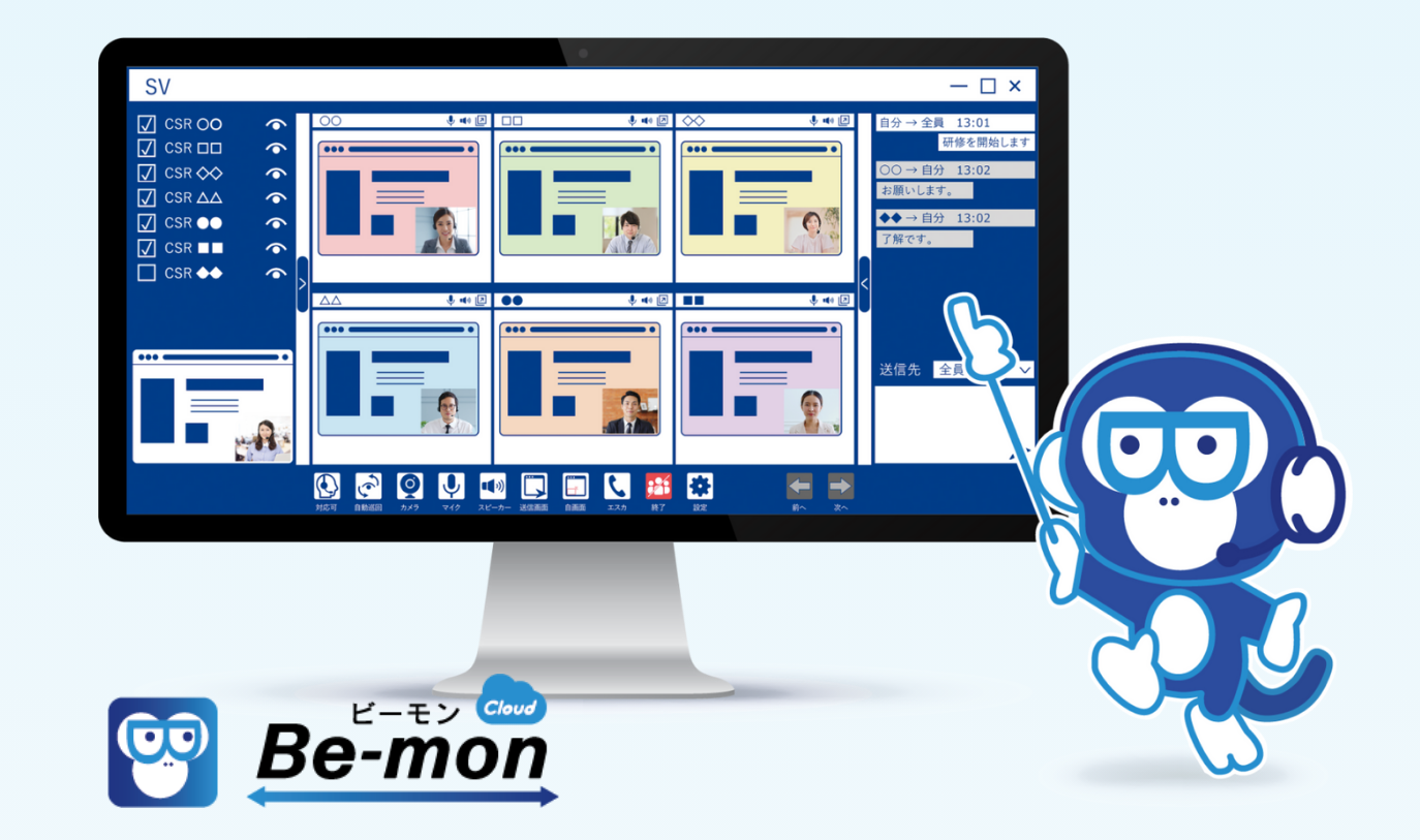 このような状況を背景に、当社が開発したオンライン研修&モニタリングシステム「Be-mon」は、テレワークをはじめとした遠隔環境において、複数名のオペレーターのPC画面や表情を管理者が一覧で確認できるシステムであり、これにより管理者とオペレーターの円滑なコミュニケーションを実現しています。