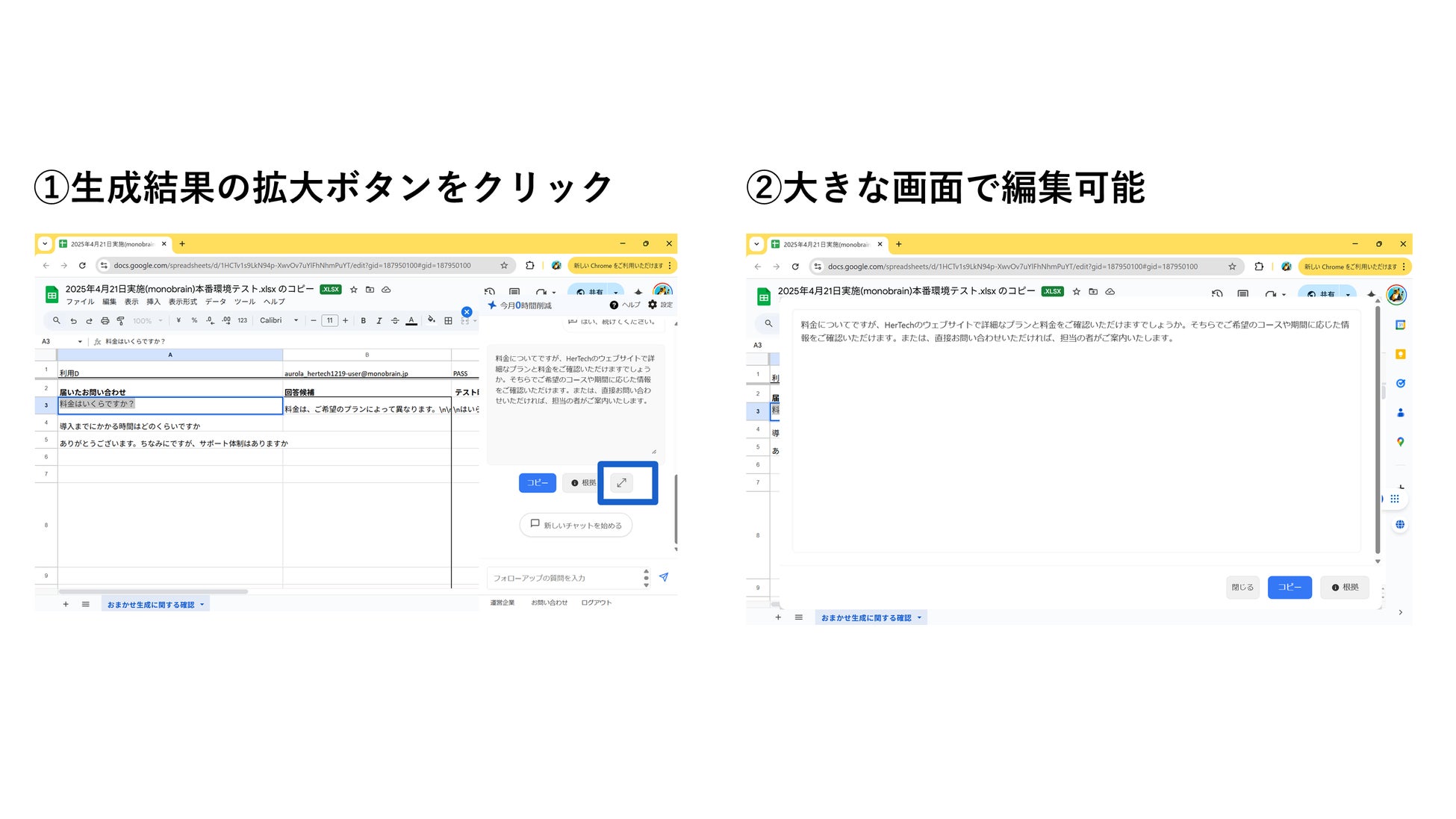 新機能「拡大編集機能」により、オペレーターはFastFlowのサイドバーに表示されたAIの回答案を、より大きな専用画面で詳細に確認し、必要に応じてスムーズに修正を加えることが可能になります。
