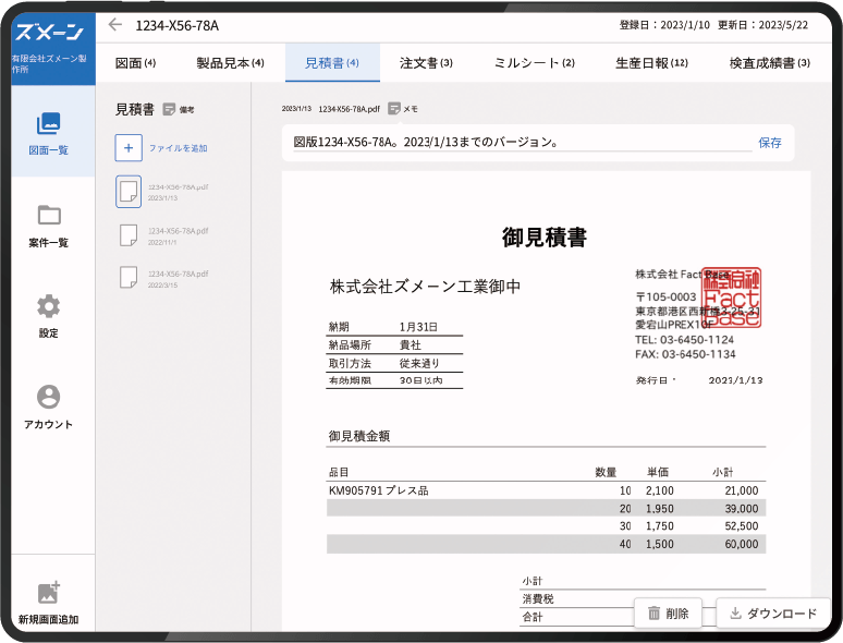 過去の類似図面を簡単に検索する機能や、製造現場のノウハウを蓄積する機能も搭載されており、見積業務から案件管理、製造、品質管理まで、すべての業務を図面データの活用によって効率化します。