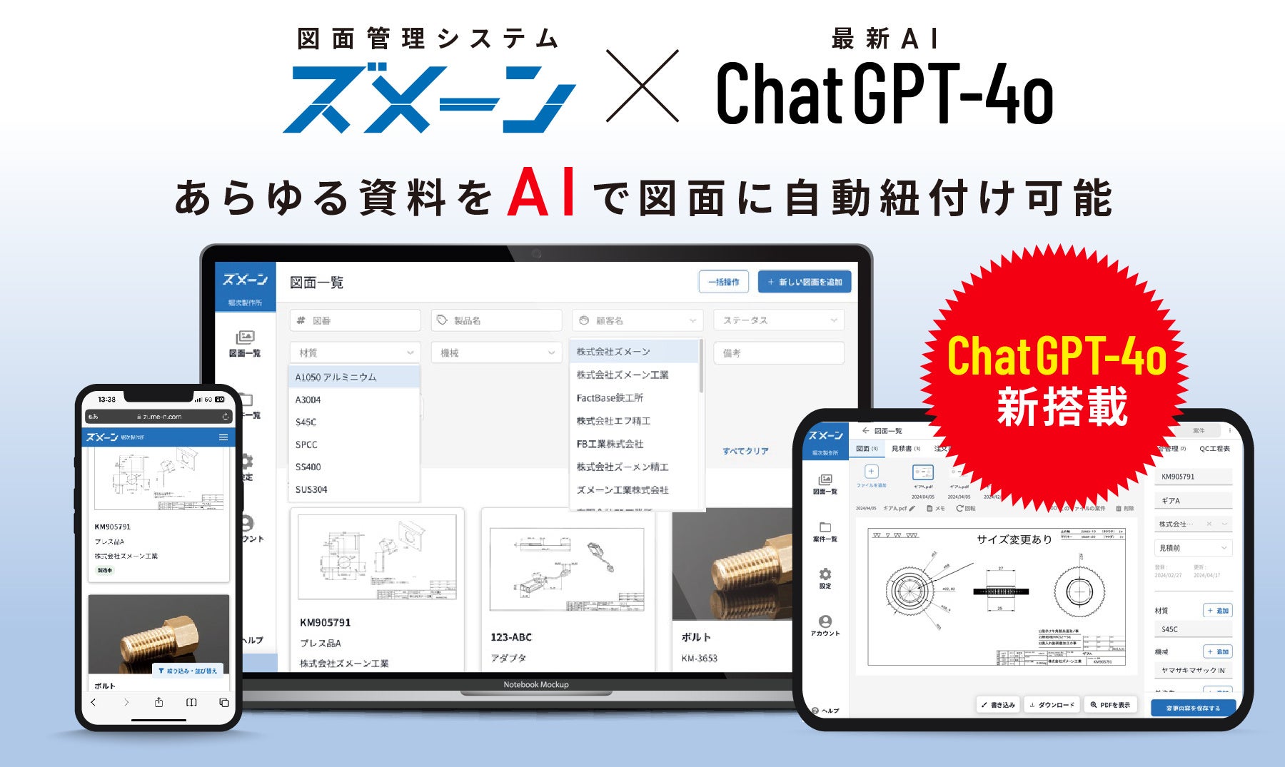 「ズメーン」は、図面と関連書類を紐づけて、クラウド上で一元管理できる月額制のサービスです。 スマホやタブレットなど、あらゆる端末からアクセス可能で、簡単に図面をアップロードできます。