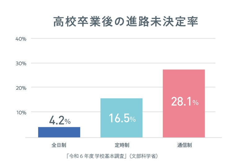 高校生の新卒採用を検討している企業は「明るさやコミュニケーション力」を重視する傾向が強く、「通信制高校の生徒」というだけで、企業側から敬遠されることは珍しくありません。加えて、通信制高校の生徒は「学校に通う」という機会が少なく、居住地も各地に点在しています。結果的に、学校や友達との関係性が強くならないまま卒業を迎えてしまうケースも多く、そのような状況下における「進路未決定のまま卒業」は、さらに社会的孤立を深めてしまう要因にもなっています。