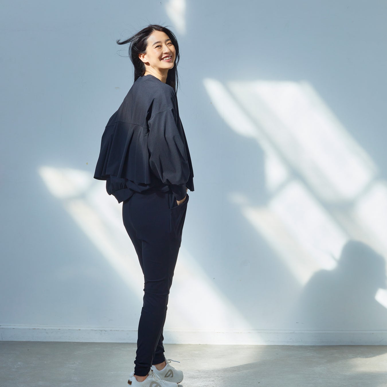ウエストの中央にタックを寄せたトップス。布の重なりが織りなす陰影が、コーディネートに深みを与えてくれます。シボ感のある表情豊かな素材もたのしい。合わせたテーパードはジョキニーに続くKariAngの新定番。