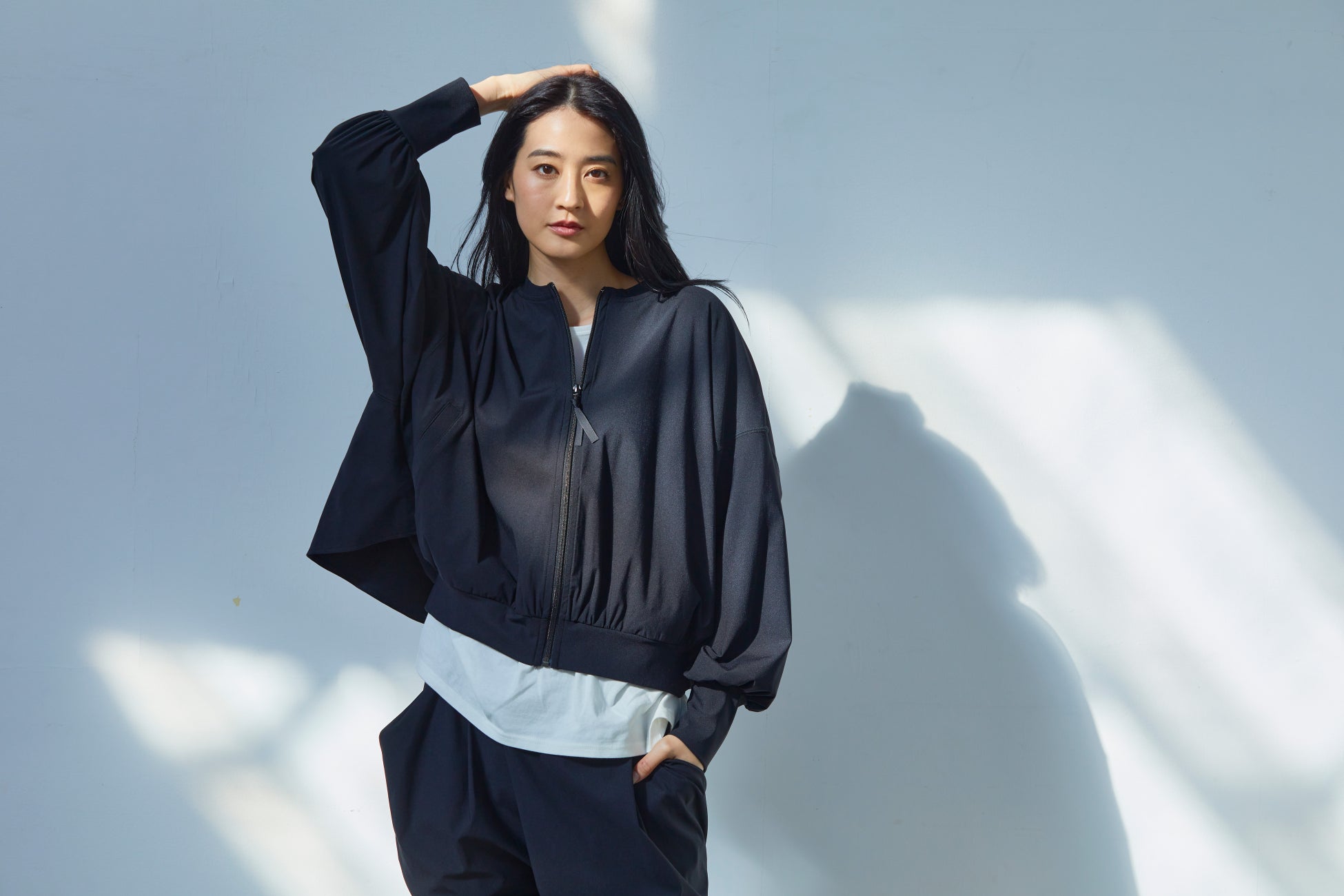 深いVネックラインが特徴のブルゾンは、カーディガン感覚で。肩のラインにあしらったタックフリルがアクセントになっています。伸縮性に富んでいるので、旅先やゴルフなどアクティブな日のおともに。