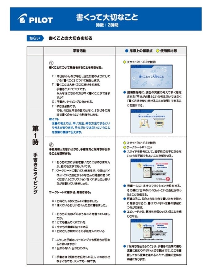 本年度のプログラムにおいても、タブレット端末などを併用しながら、手書きとタイピングそれぞれの良さを理解し、その適切な使い分け方、手書きが深い思考をもたらすこと、加えて日本語の歴史や文化についても学ぶことができる内容となっています。各種教育現場で1~2時間で学習することを想定した構成で、指導用スライド及び指導案、児童が使うワークシートが無料で提供されます。また、当社として実践用教材の消せるボールペン「フリクションボールノック」を授業に参加する児童に1本ずつ提供します。