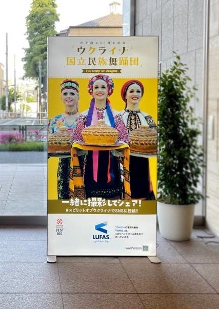 ツアーを記念して民音音楽博物館(住所:東京都新宿区信濃町8番地)1Fに公演記念特設ブースがオープンしました。写真右側の看板は、TONICHIが製造し、グループ企業のトライ(住所:東京都江東区、社長:潟永秀一郎、以下 トライ)が販売する100%ペットボトル再生布を使った電照布看板「LUFAS®(ルーファス)」です。舞踊団とほぼ等身大の大型の布看板となります。ぜひ一緒に写真を撮って「#スピリットオブウクライナ」「#LUFAS」「#TONICHI」を付けてSNSに投稿してください。