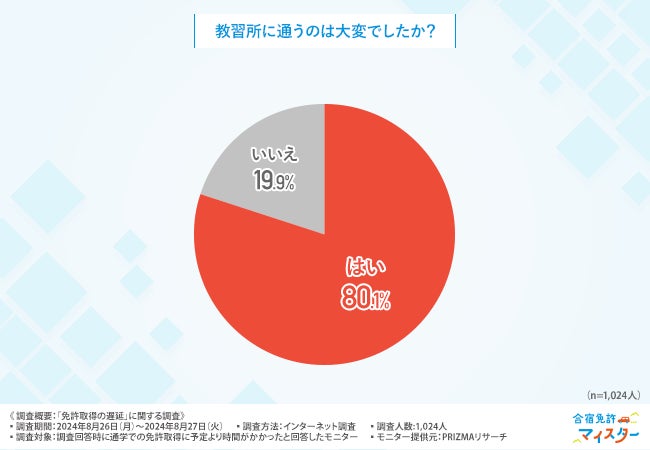 「教習所に通うのは大変でしたか?」と質問したところ、約8割の方が『はい(80.1%)』と回答しました。