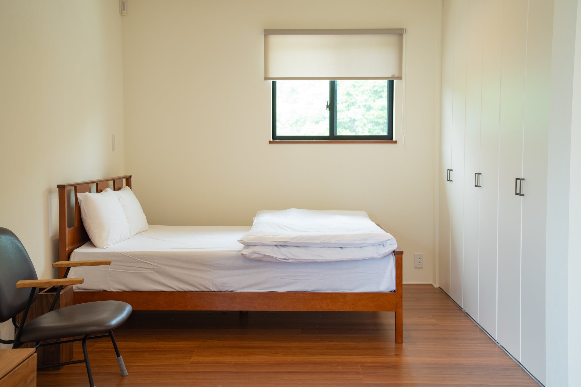 ダブルベッド1台を完備。3名様以上でのご宿泊時には、敷布団を最大4セットまでご用意可能です。周囲の自然を感じながら、心地よい眠りをお楽しみいただけます。