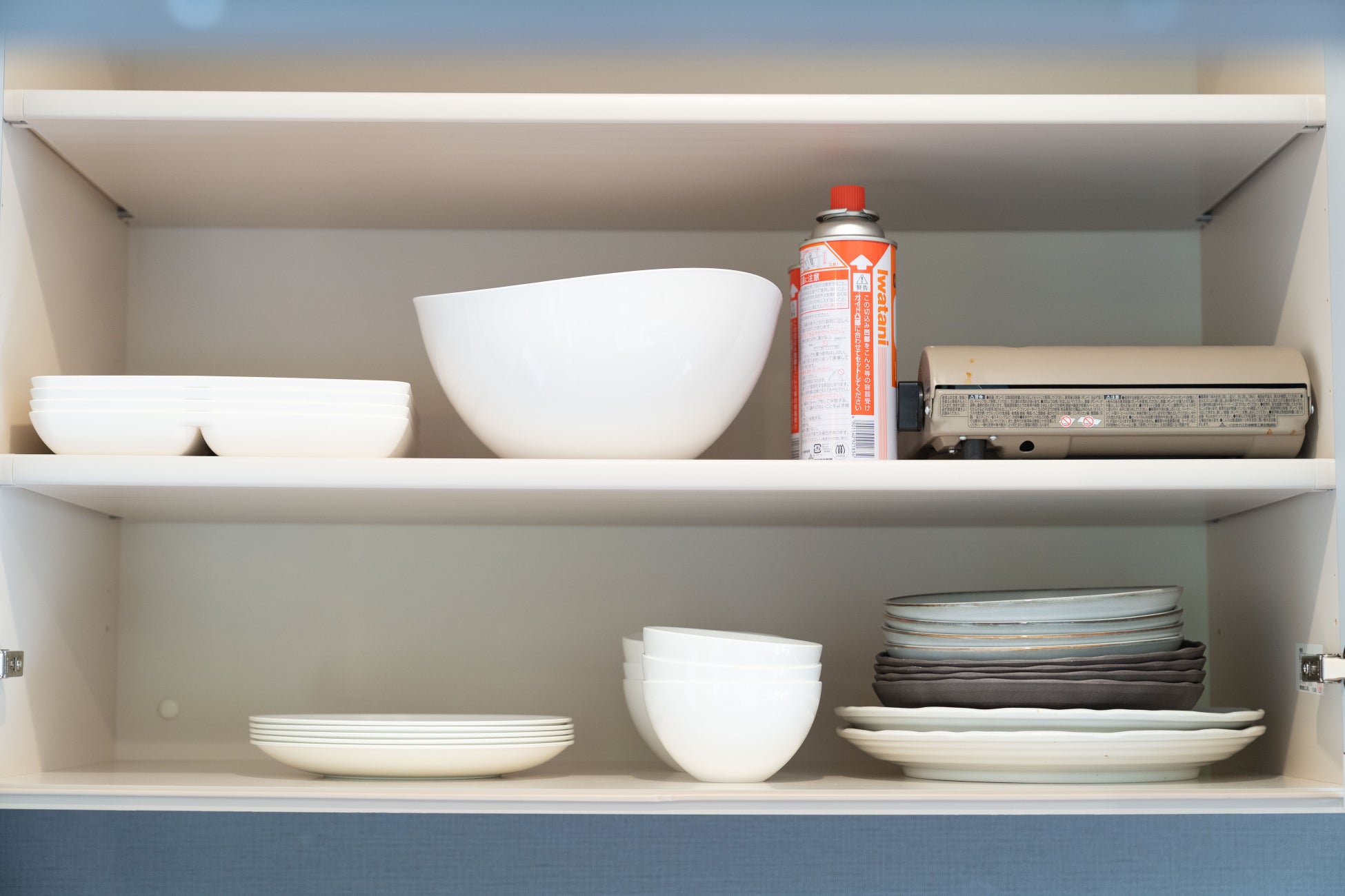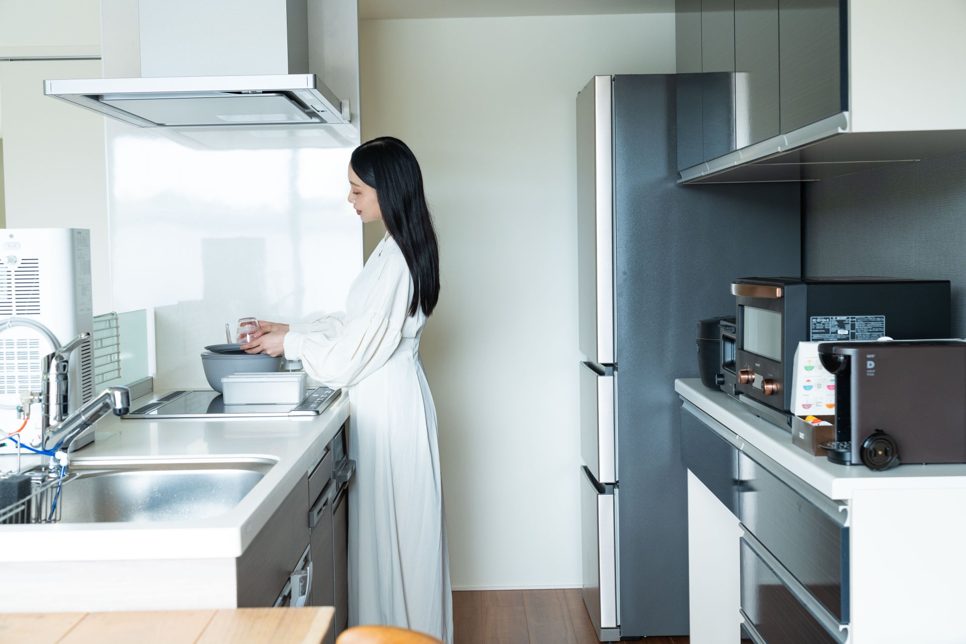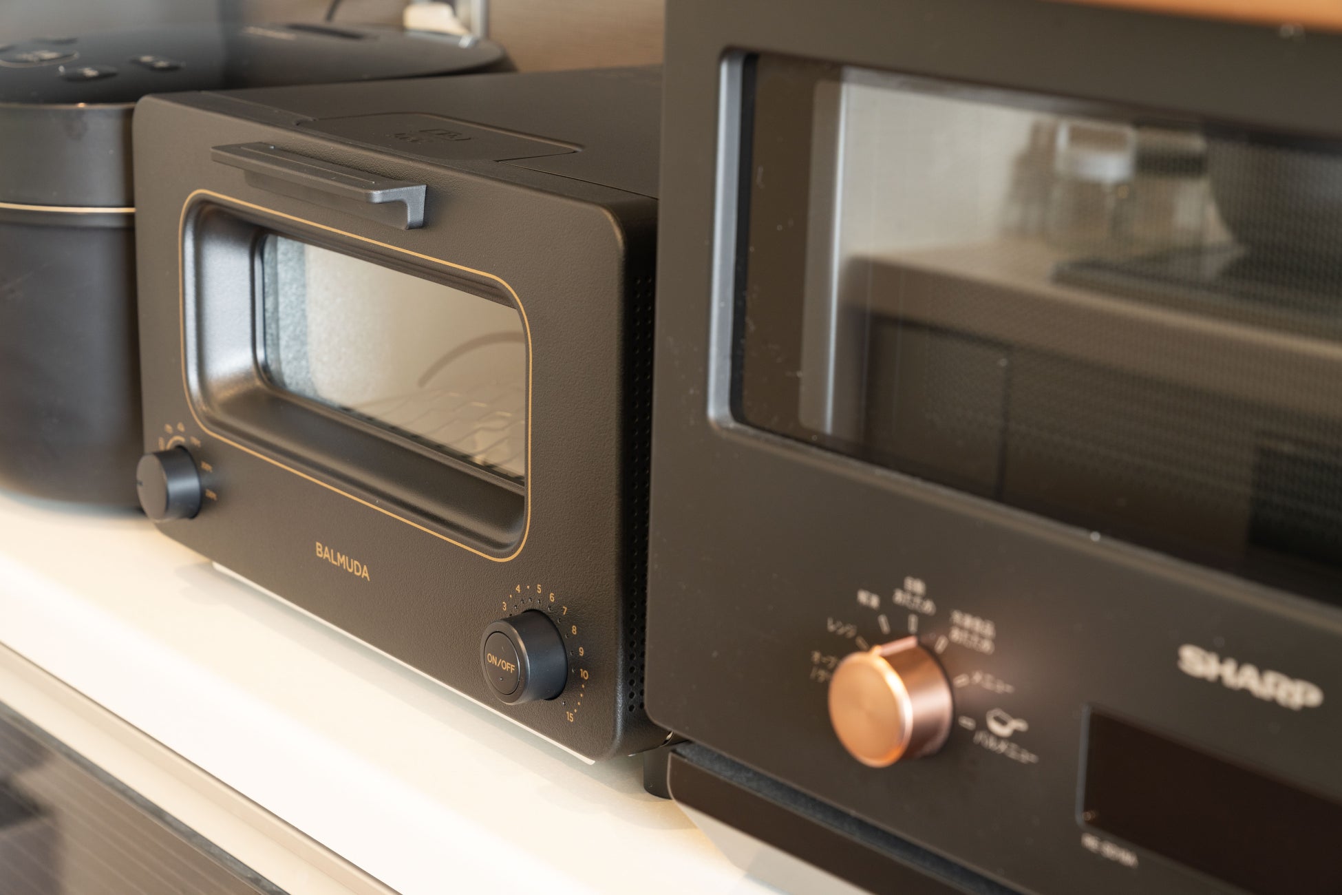 キッチンスペースには、BALMUDAのトースターや炊飯器、冷蔵庫、オーブンレンジ、ウォーターサーバー、電気ケトルなどを完備。IHコンロや調理器具、食器類も豊富に取り揃えており、長期滞在や自炊をご希望のお客様にも快適なひとときをお届けします。