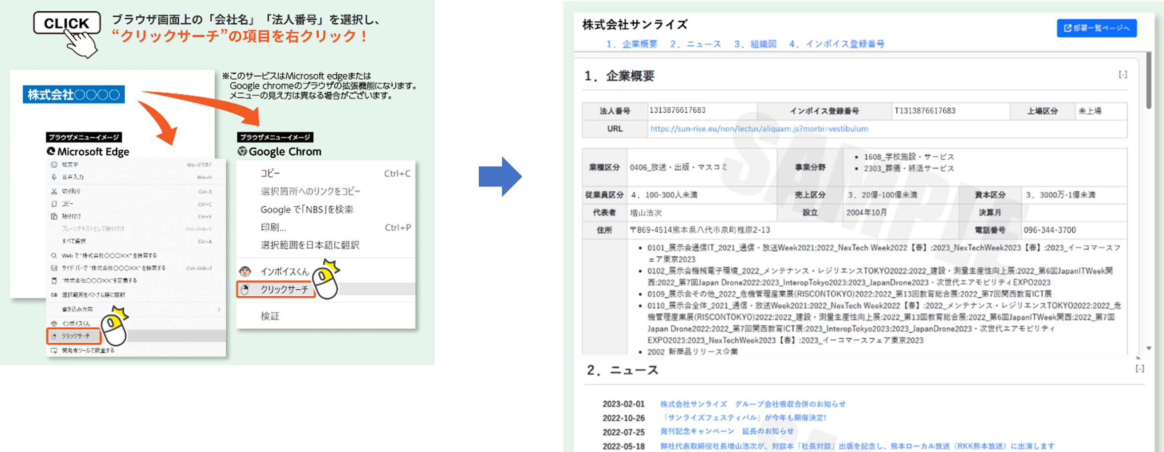 会社名、法人番号をブラウザ上から右クリックすると、「企業概要」「ニュース」「組織図」「インボイス登録番号」が表示されます。