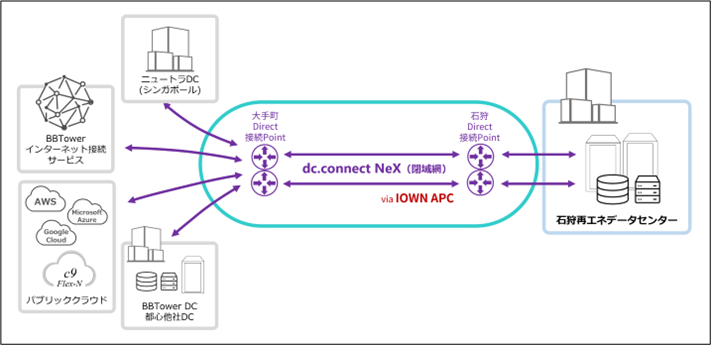 本サービスは、石狩再エネデータセンターをご利用の各企業・団体への提供はもとより、同データセンターが提携する「ニュートラDCシンガポール」(NeutraDC Singapore: シンガポールを拠点に、高性能かつ高信頼のデータセンターサービスを提供する事業者)との接続においても活用される予定です。これにより、地方データセンターを起点としながら、東京・大手町エリアを経由し、シンガポールをはじめとする海外拠点への接続が可能となります。国内外の主要データセンターと柔軟に接続できる環境を整備することで、グローバル展開を視野に入れたサービス基盤の構築を支援します。