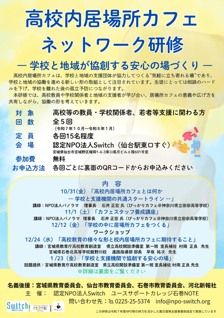 【問い合わせ先】認定NPO法人Switch 石巻NOTE(TEL:0225-25-5374)長岡・佐藤