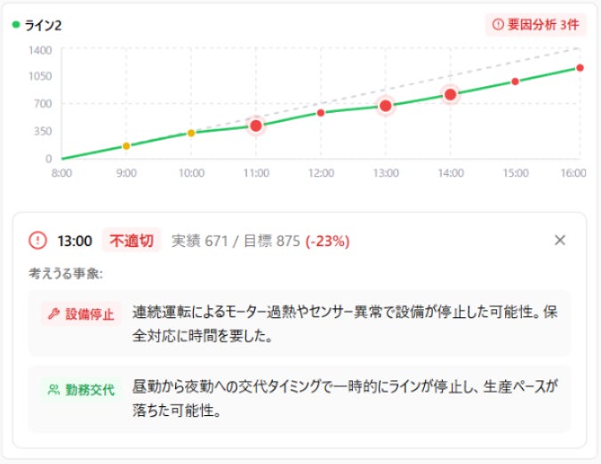 ビットクォーク株式会社が提供する「recosee(リコシー)」は、生産実績や在庫量に加え、「どの工程で」「いつ」「どのような事象が発生したのか」といった工程上の出来事を工程単位で整理・可視化します。さらに、AIを活用して計画との差異や時間当たり出来高が変化した要因を推定することで、現場での要因推定の切り口を提案します。これらの機能は、例えば、製造現場の大型モニター上に常時表示することで、関係者が同じ指標・同じ画面を見ながら現状把握を行い、次の行動を判断しやすい環境づくりを支援します。