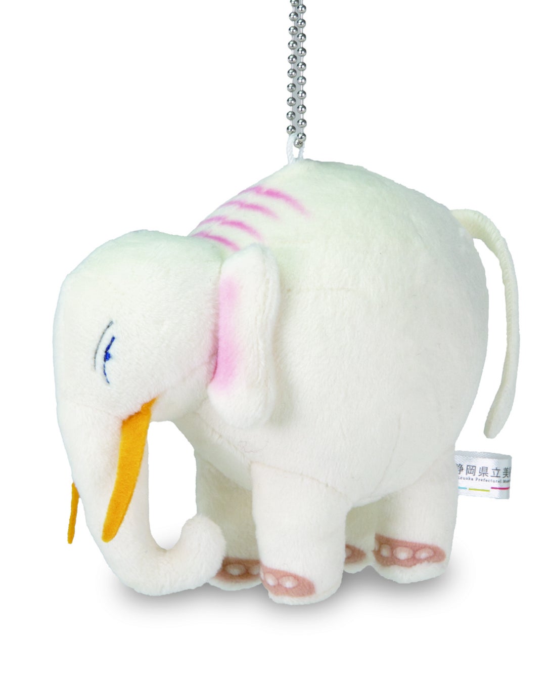 《樹花鳥獣図屏風》右隻の白象をぬいぐるみにして、ボールチェーンを付けたマスコットにしました。洒落の効いた「じゅかぞうーJUKAZOOー」の名付け親は、静岡県立美術館の職員さん。英語表記にはZOOの文字を入れて、鳥獣があふれる《樹花鳥獣図屏風》の雰囲気を海外の方にも連想してもらいやすい工夫が凝らされています。