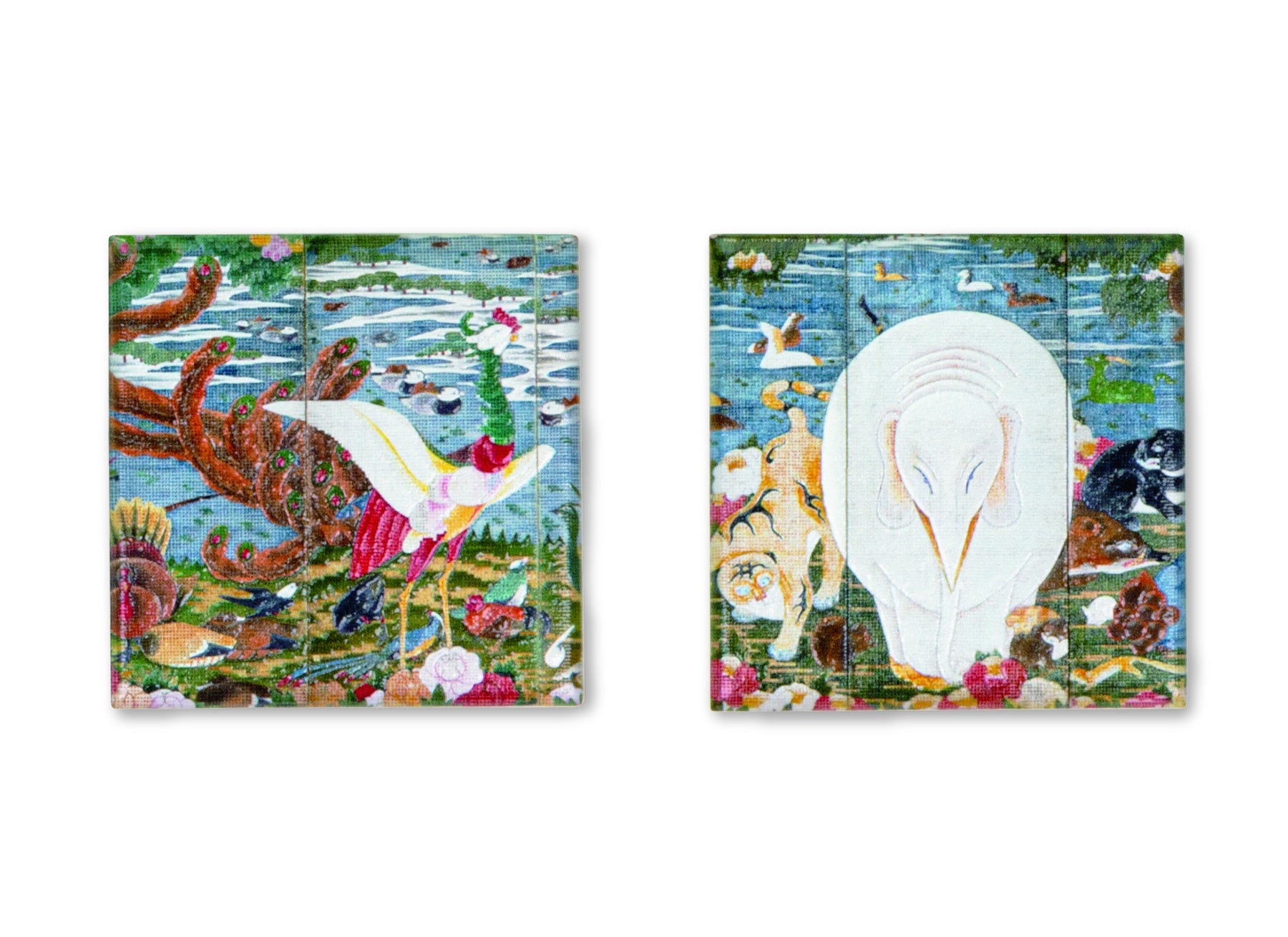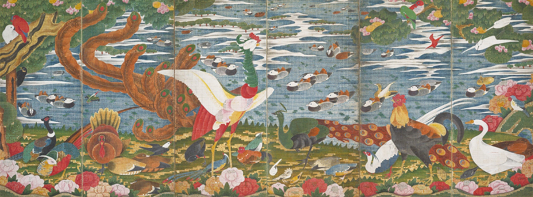右隻は白象を中心にした「獣尽くし」、左隻は鳳凰を中心にした「鳥尽くし」で、身近な生き物から外国の見たこともない生物、さらに想像上の生き物まで、吉祥性の強い鳥獣が水辺に群れ集う様子が描かれています。