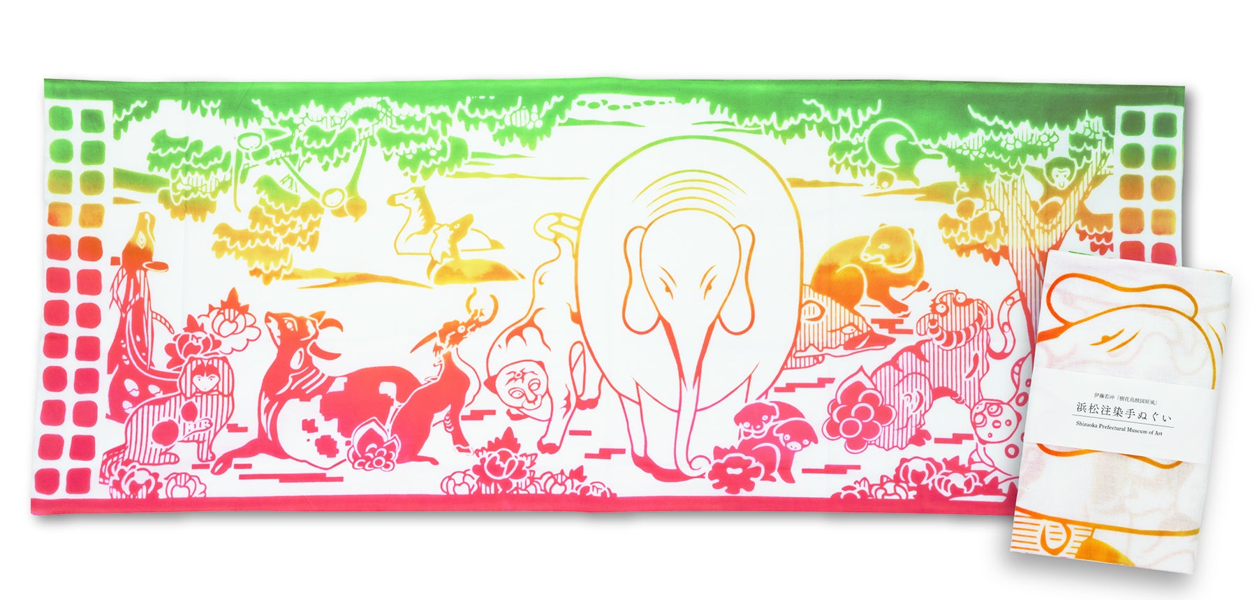 大正初期に「浴衣染め」から始まった浜松注染。肌に優しいやわらかさで、水ぼかしによる揺らぎのある表現が特徴です。はっきりとした精細な印象の《樹花鳥獣図屏風》の右隻のモチーフを、淡い花の赤色から木々の緑色へと移ろうグラデーションに染め上げました。若冲の描く独創の世界を楽しめる、一味異なる若冲グッズです。