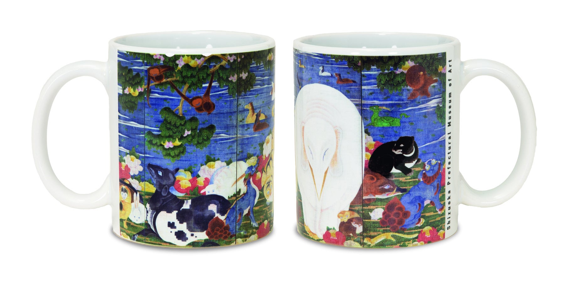 《樹花鳥獣図屏風》の右隻の一部を側面にぐるりとデザインしたマグカップです。実際の作品よりやや明るい仕上がりですが、朝の食卓で使うことを想定して、暗さや黄味の出ないよう色味を配慮しました。大人の男性が持ってもゆとりのある持ち手は指が本体に触れにくく、熱さを感じにくい仕様です。