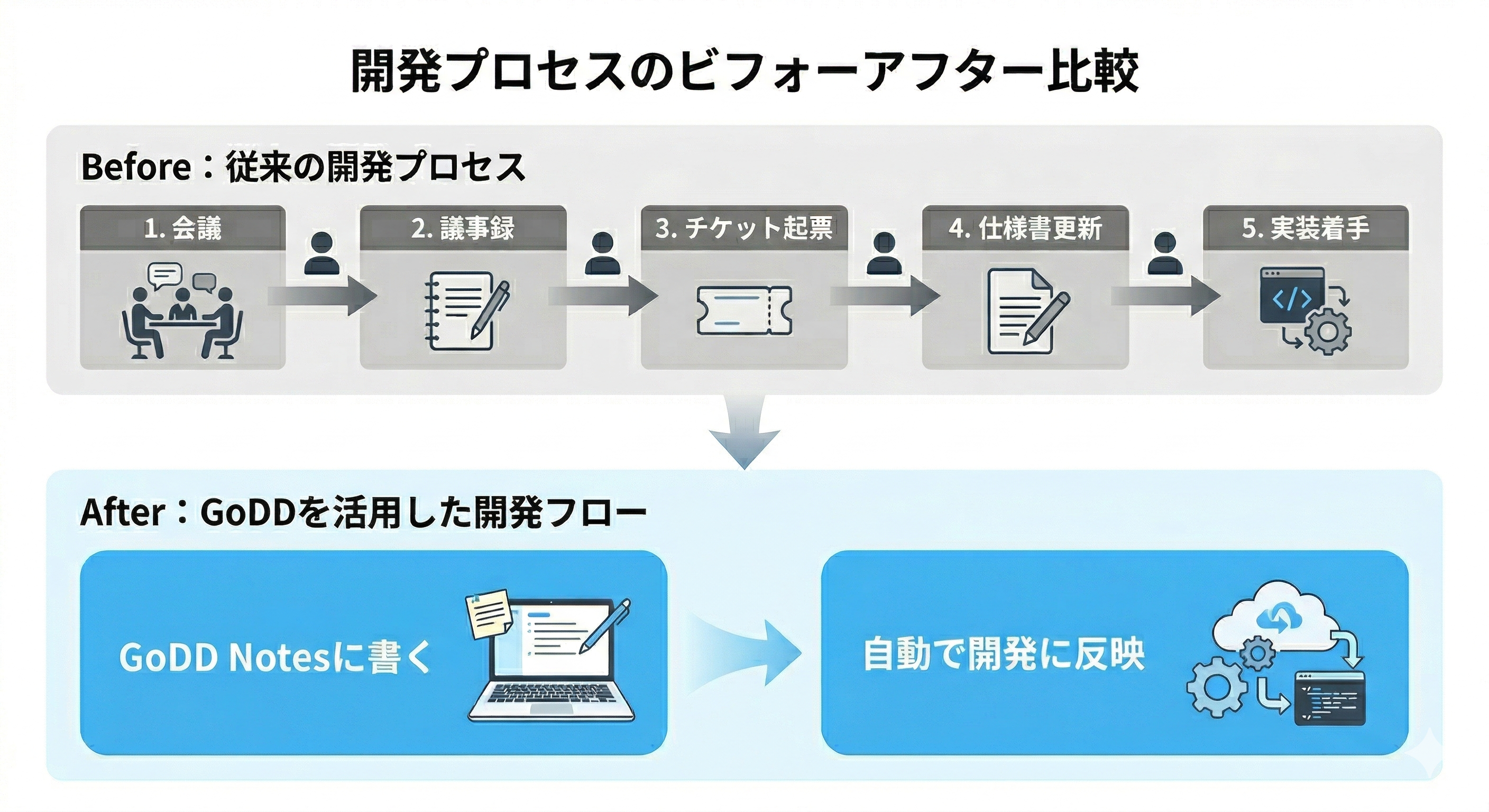「会議→議事録→チケット起票→仕様書更新→実装着手」という従来の多段階プロセスが、「GoDD Notesに書く→自動で開発に反映」というシンプルなフローに変わります。しかも、開発が進むと次の確認事項が自動でリストアップされるため、高速で改善サイクルが回り続けます。
