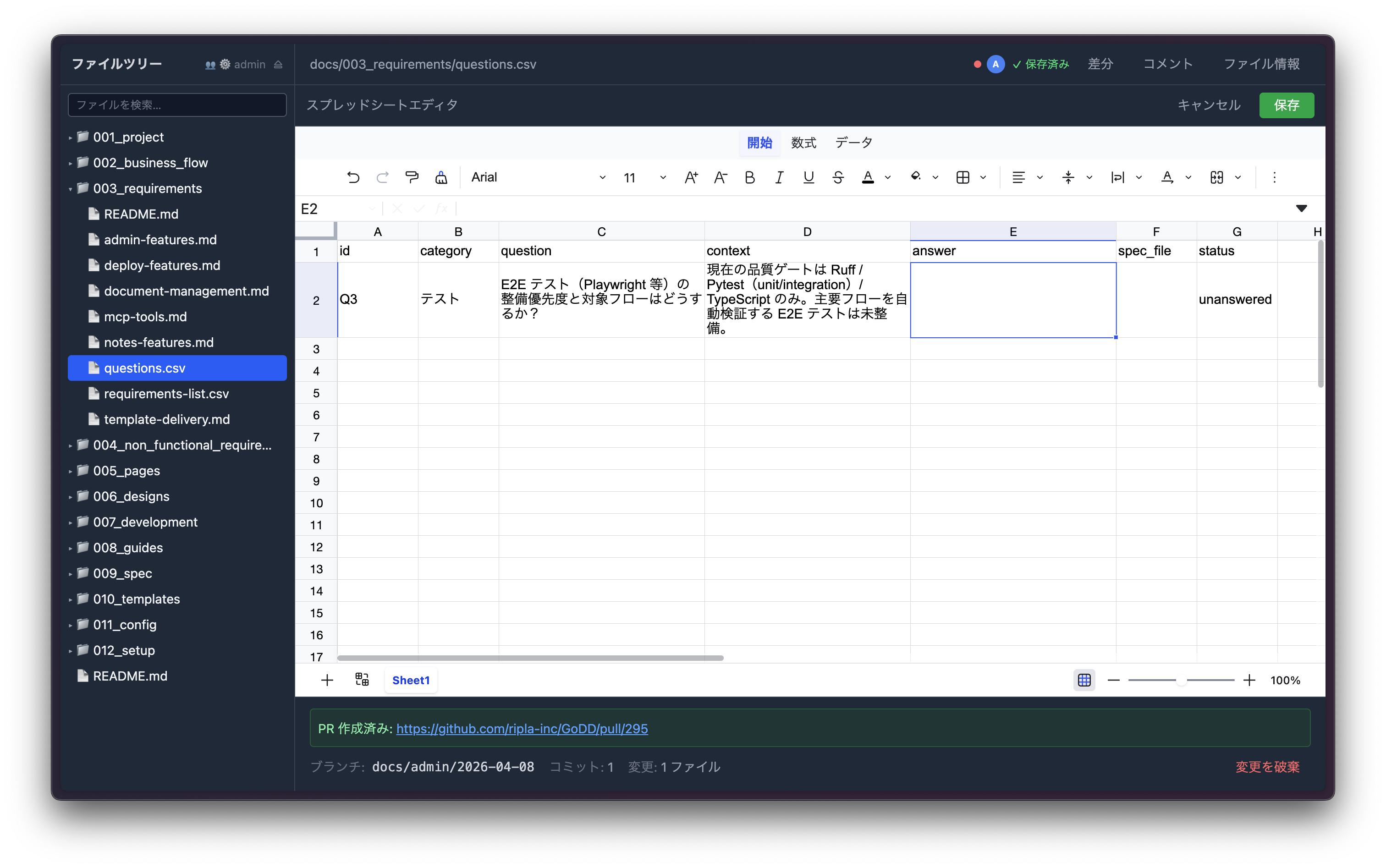 Googleスプレッドシートやドキュメントのような馴染みのあるUIで操作できるため、Git操作やプログラミングの知識は一切不要です。「ここをこうしたい」とブラウザ上で記載するだけで、その変更が自動的に開発チームへ連携されます。