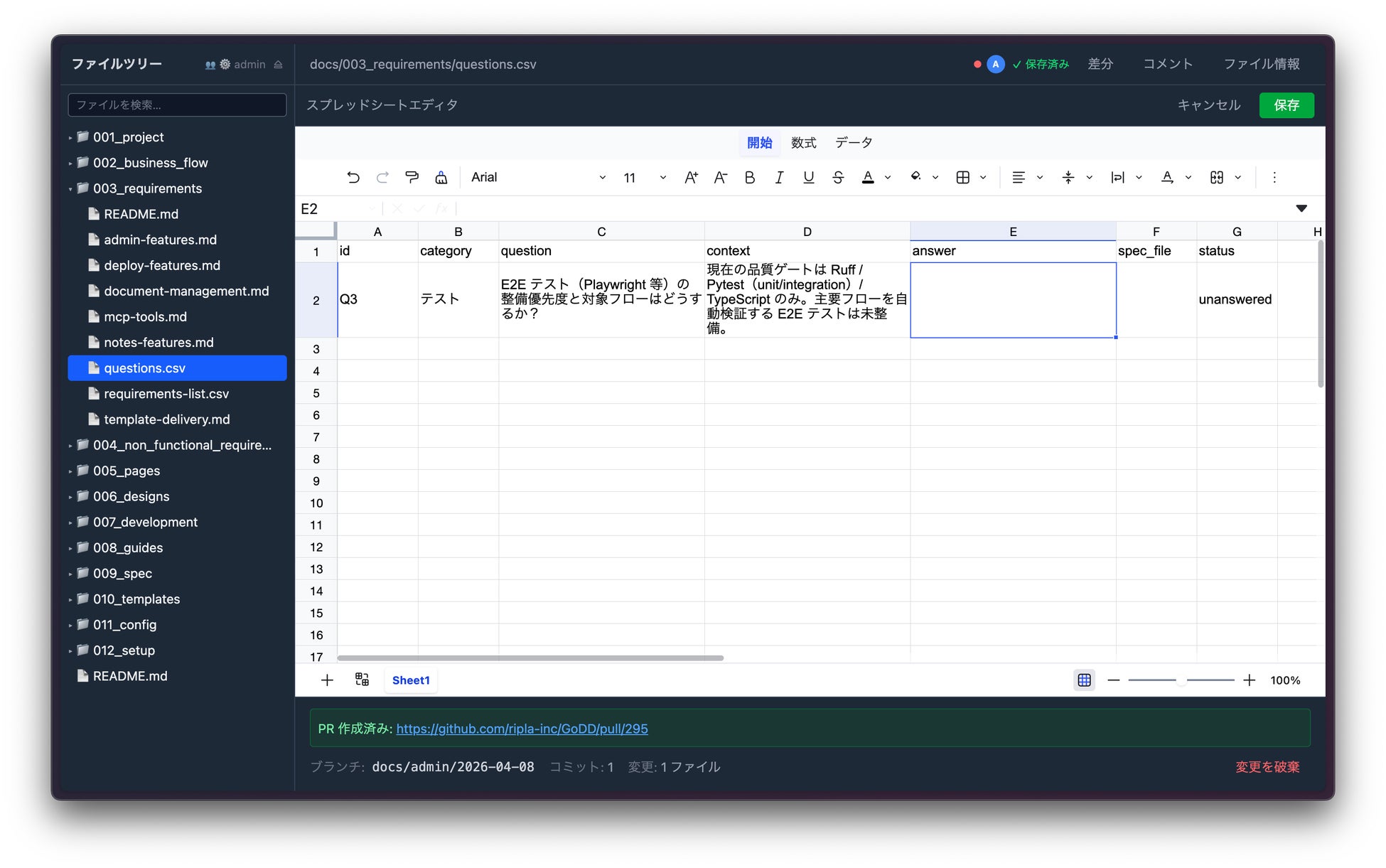 担当者はスプレッドシート形式の質問リストを見て、回答欄に記入するだけ。さらに、質問への回答に加え、実際に動くテスト環境を触りながらフィードバックをすることも容易です。「この機能も追加したい」「ここを変更したい」といった要望をそのままGoDD Notesに書き込むだけで、記入した内容は自動で開発チームに連携され、仕様書が最新状態にアップデートされます。
