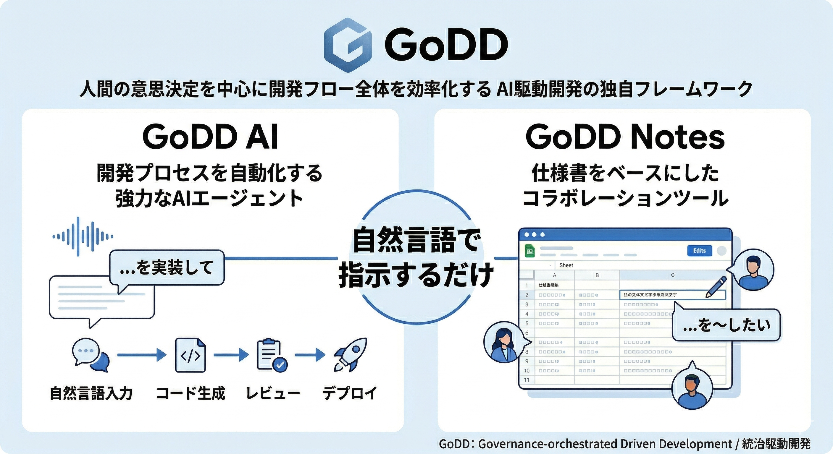 GoDD(Governance-orchestrated Driven Development / 統治駆動開発、読み:「ゴッド」)は、人間の意思決定を中心に据え、開発ワークフロー全体を効率化する、AI駆動開発の独自フレームワークです。