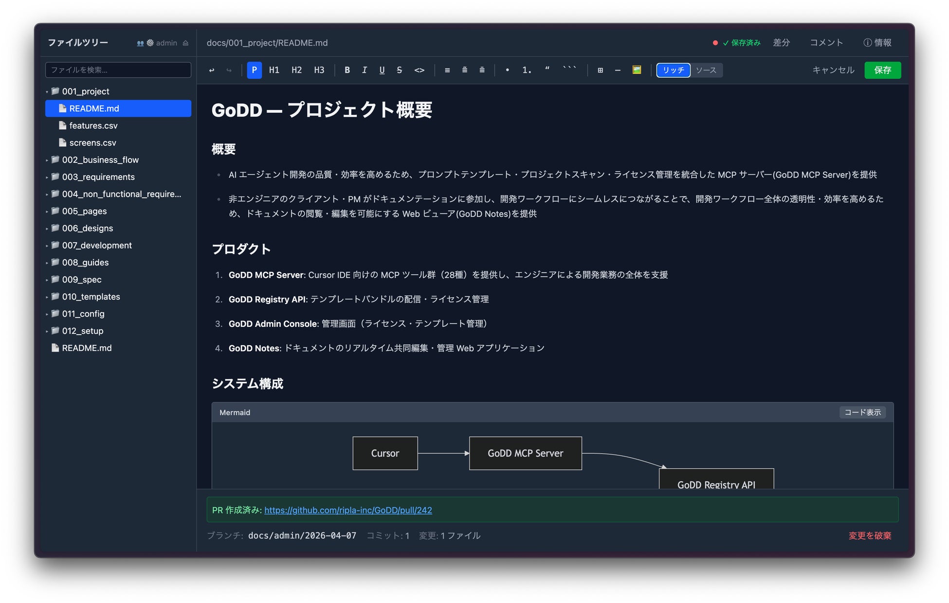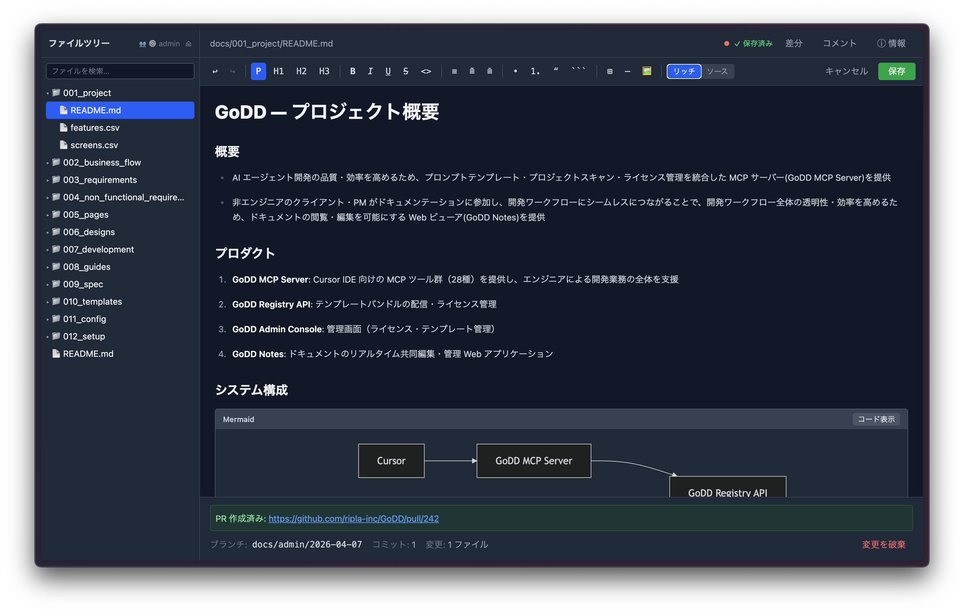 GoDD Notes は、DX推進担当者・事業責任者・PMなど、エンジニアではない方が仕様書を直接確認・編集できるコラボレーションツールです。