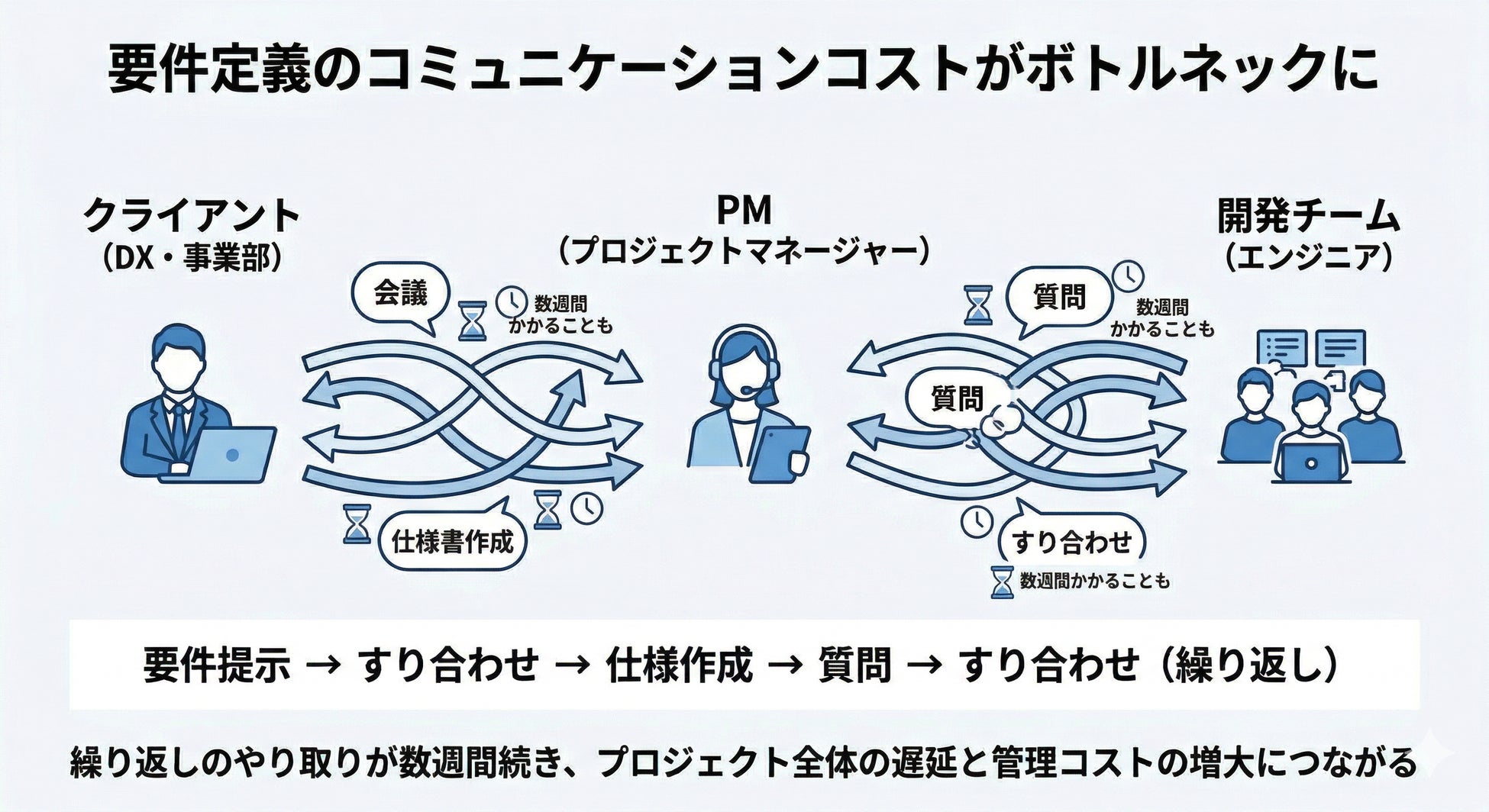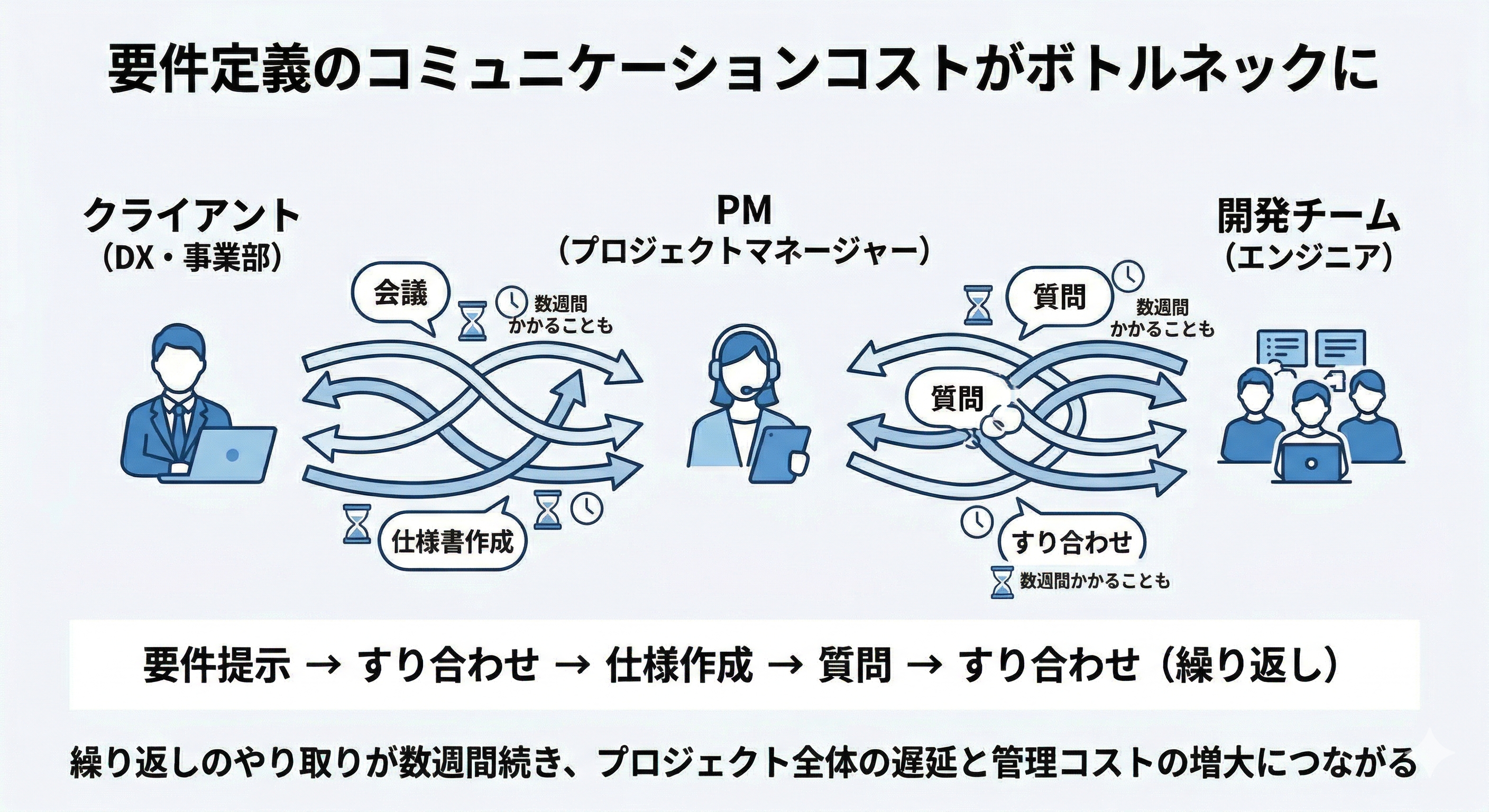 機能の規模や複雑さによっては、この一連のやり取りだけで数週間を要することもあり、プロジェクト全体のスケジュールのボトルネックになってしまいます。特に「2. 要件のすり合わせのためのやり取り」については、さらに以下のプロセスが必要になります。