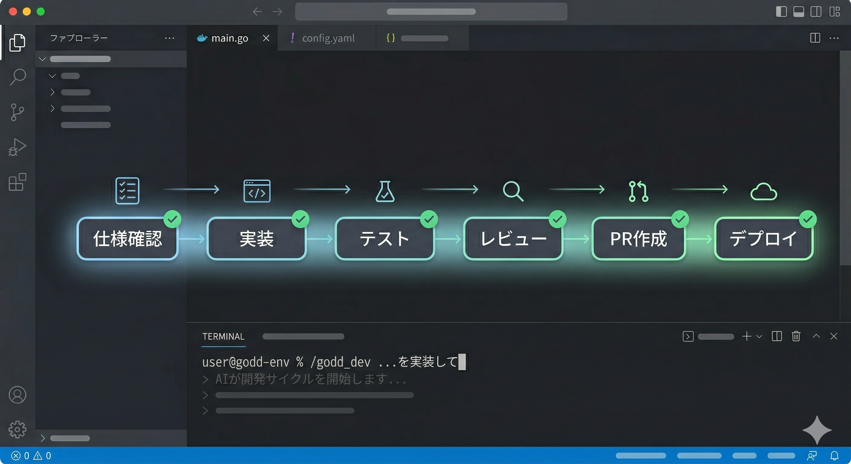 GoDD AIは、仕様確認から実装・テスト環境への反映までの開発プロセス全体を、一気通貫で実行する強力なAIエージェントです。
