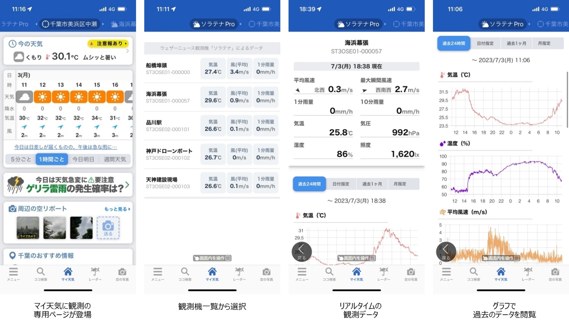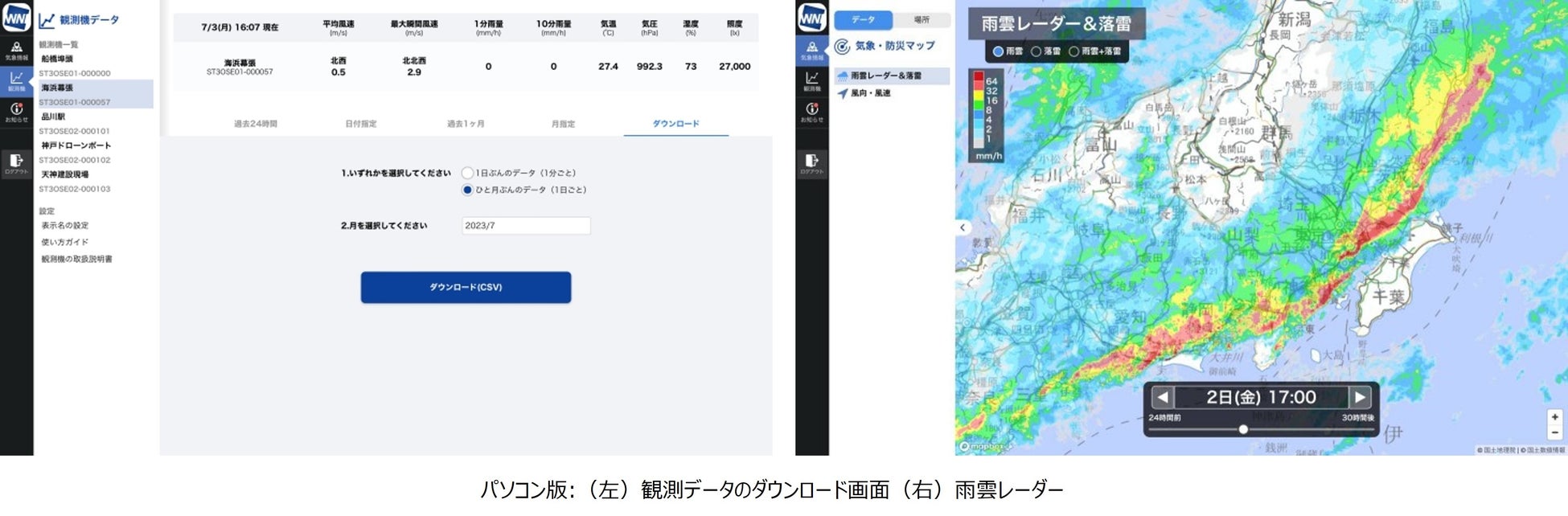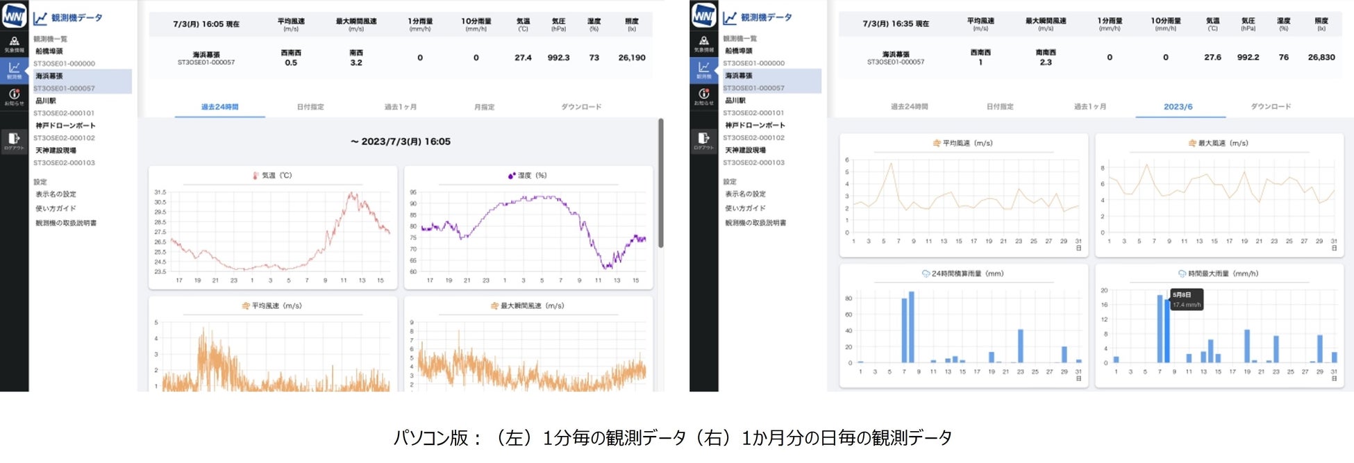 パソコン版の専用ウェブサイトでは、リアルタイムの実況や過去の観測データと合わせて気象情報を提供します。ユーザーは月や日付を指定して、日毎や1分毎の観測データをグラフで確認することができます。また、設置日からこれまでの観測データは全てクラウド上に保存されており、CSVでデータをダウンロードすることも可能です。