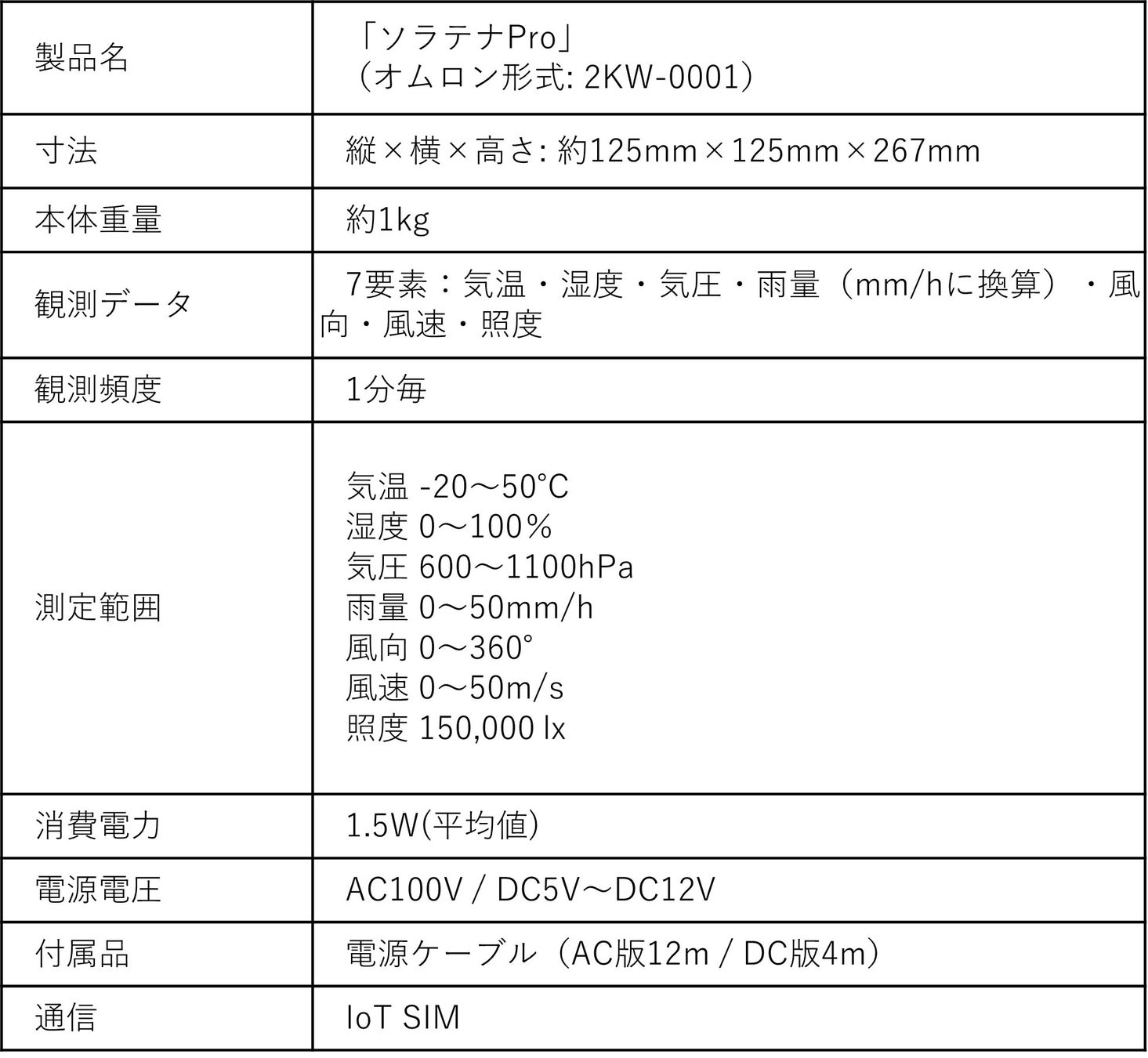 「ソラテナPro」は、気温・湿度・気圧・雨量・風向・風速・照度の7つの要素を1分毎に観測する小型の気象IoTセンサーです。「ソラテナPro」は、センサー開発を得意とするオムロンと予報精度No.1*1の技術を誇るウェザーニューズが、両社の強みを活かして共創し開発しました。同製品は、オムロンのセンシング技術によって雨風のセンサーの性能を高めており、災害リスクが高まる雨量50mm/h、風速50m/sの大雨・強風を観測することができます。