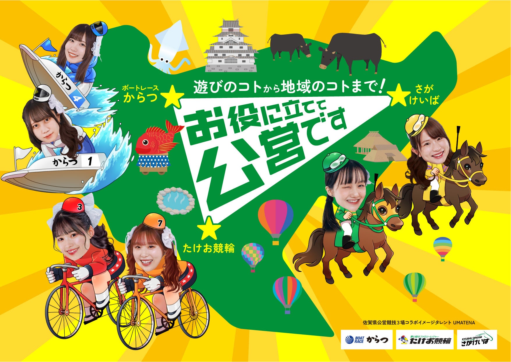 佐賀競馬、たけお競輪、ボートレースからつ(以下、「3場」)は、佐賀県内の公営競技の認知度向上を目的としたコラボレーション企画「遊びのコトから地域のコトまで!お役に立てて公営です」を実施します。イメージキャラクターには佐賀県発の6人組アイドルグループ”UMATENA”を起用。各場でのライブイベントや抽選で景品の当たるクイズキャンペーンを開催。コラボレーションのスタートとして、PR動画「UMATENAのお役に立てて公営です さがけいば篇」を本日よりさがけいばの公式YouTubeチャンネルで公開します。「ボートレースからつ篇」「たけお競輪篇」は2025年初旬に公開予定です。