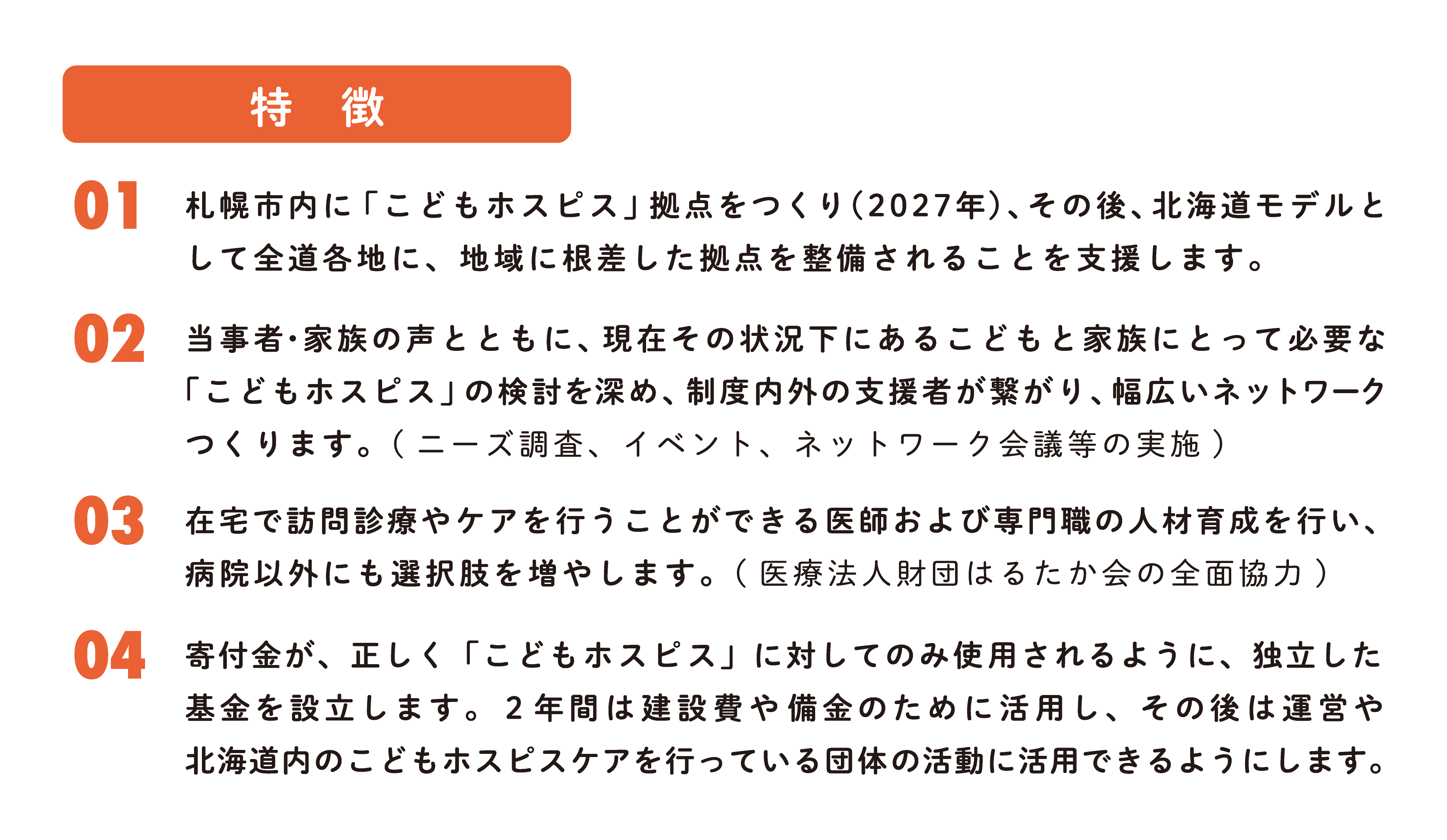 NPO法人ソルウェイズは、2027年札幌市内に「こどもホスピス」拠点をつくります。建物がゴールではなく、当事者・家族、医療・福祉施設や非営利団体、地域の団体や企業等でネットワークをつくり、LTCの子どもと家族の両方を対象として、その地域に合った小児緩和ケア、レスパイトケア、ターミナルケア、家族支援等が行える地域づくり、社会づくりを行います。その活動がこどもホスピスケアであるとソルウェイズでは考え、北海道全体に広がるロールモデルとなるような活動を実施します。
