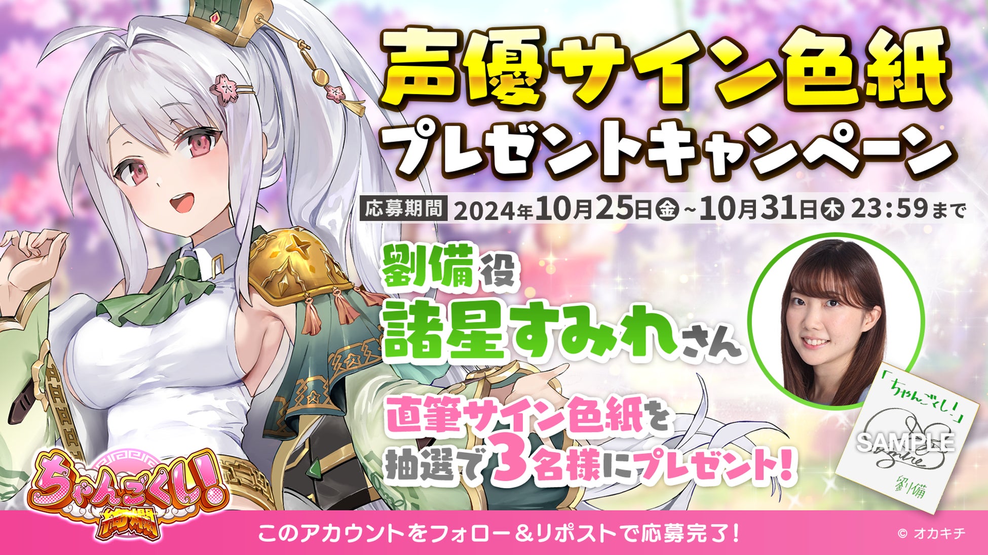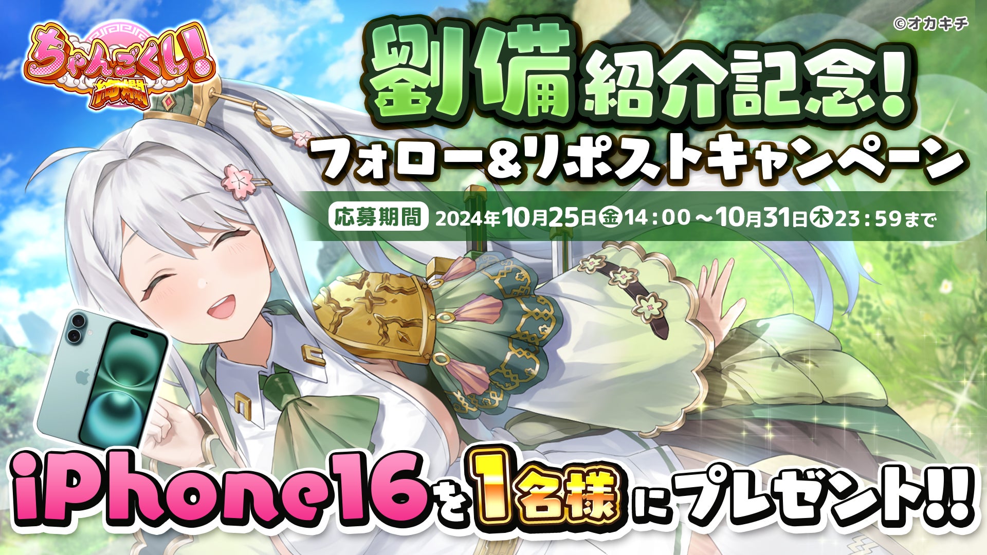 『ちゃんごくし!絢爛』は、かわいい武将キャラを育成して軍団を結成し、中華統一を目指す戦略バトルRTSゲームです。この度は、主人公『劉備』の紹介を記念して、公式Xにて3大キャンペーンを実施します。全てのキャンペーンに参加いただいた方は、当選率がUPしますので、ぜひ、公式Xをフォローして各キャンペーンにご参加ください。