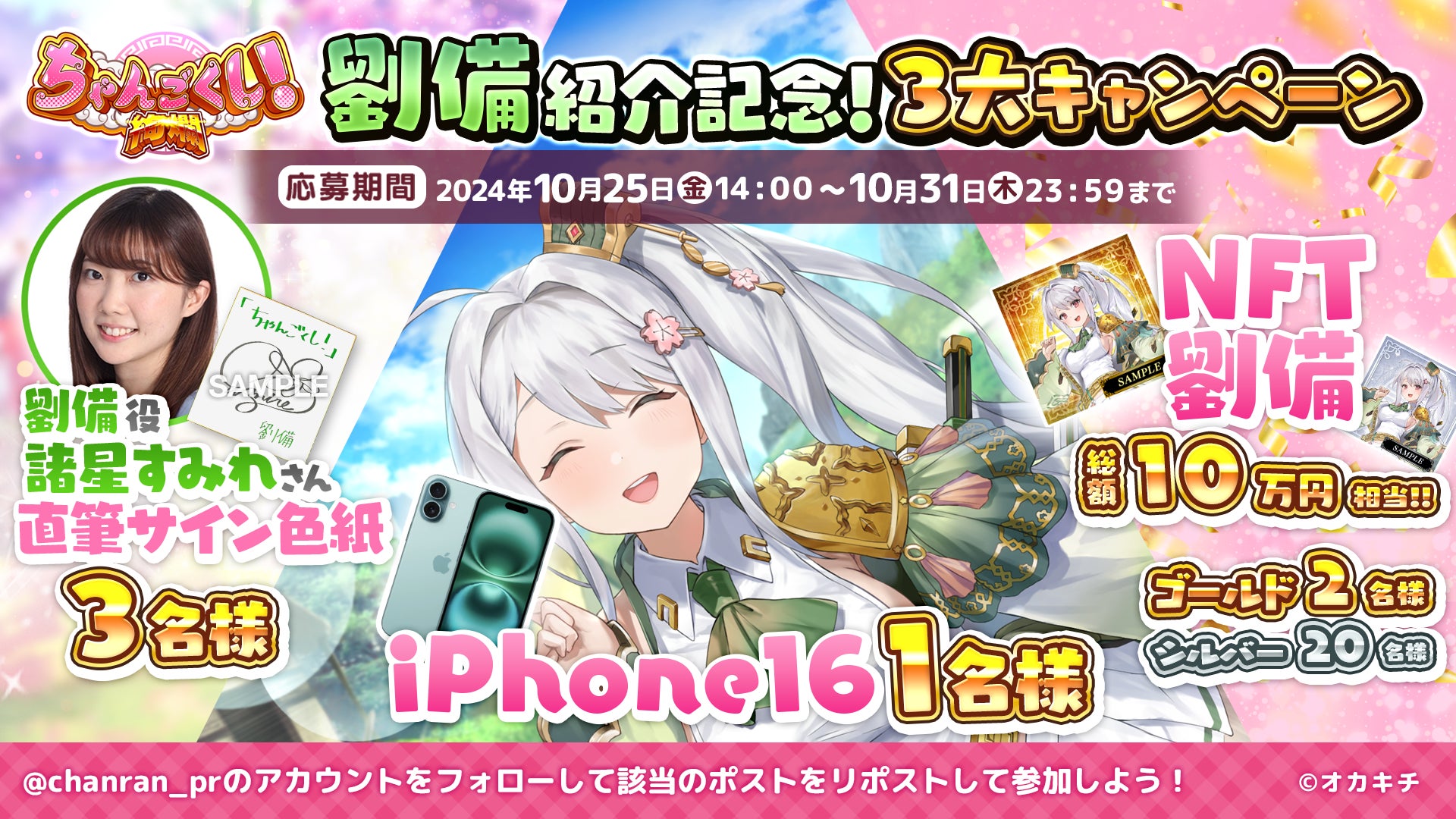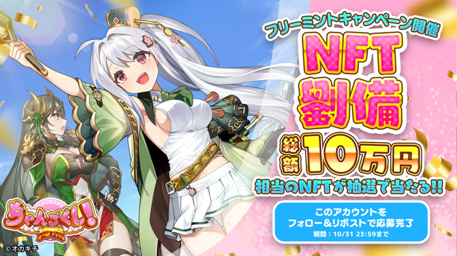 「次の夢中をつくる会社」をポリシーに、数々の人気ゲームの開発を担う株式会社オカキチ(本社:東京都渋谷区、代表取締役:岡田茂)は、オリジナルNFTゲーム『ちゃんごくし!』シリーズの第二弾タイトル「ちゃんごくし!絢爛(けんらん)」にて、10月25日(金)より公式Xで豪華3大キャンペーンを実施します。