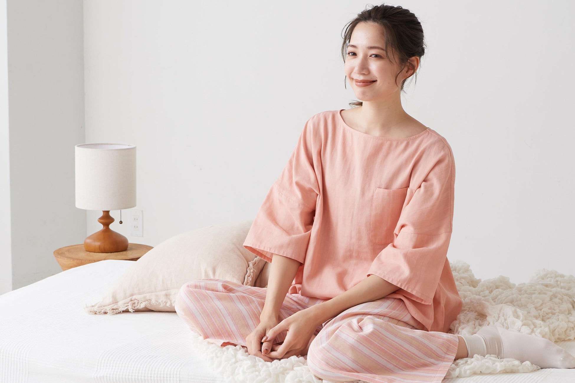 毎年入荷しては完売する大人気のダブルガーゼルームウェア、今年はシックなネイビーと顔映りのよいコーラルの2色展開です。洗えば洗うほどふわふわになるガーゼ生地は、ほおずりしたくなる心地よさ。無地とストライプの2重ガーゼがおしゃれ感度高く、洗い替えがほしくなるリピーターの方も続出です。