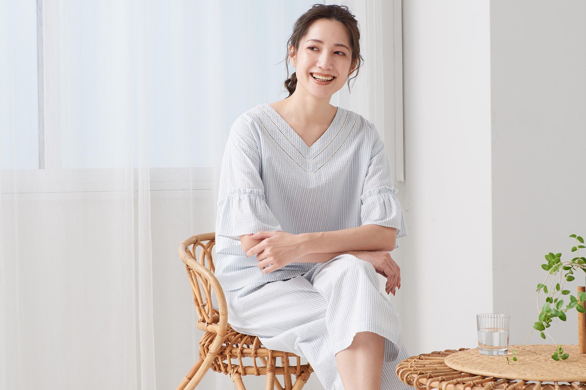 昔から夏の定番として親しまれてきた綿サッカー生地を使って、大人可愛いデザインに仕上げたルームウェア。凹凸のある生地で肌に接する面積を少なくしているので、涼しくさらさらな着心地。シボ感のおかげで、夏らしい淡色でも透け感があまり気にならず、畳みジワも気にしなくていいので、夏の旅行にももってこいです。
