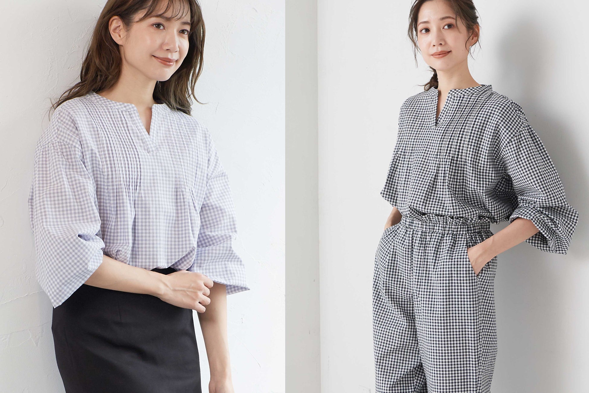 爽やかなコットンローン素材を、人気のギンガムチェック柄に。胸元にはピンタックが入っていて、裏地のないルームウェアながらも透けにくく、ブラウスのようにも着こなせます。たっぷりと布地をとった袖は、肘上でとめてパフスリーブにも。人目についてもおしゃれなワンマイル対応のルームウェア。