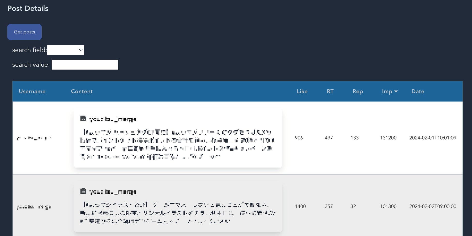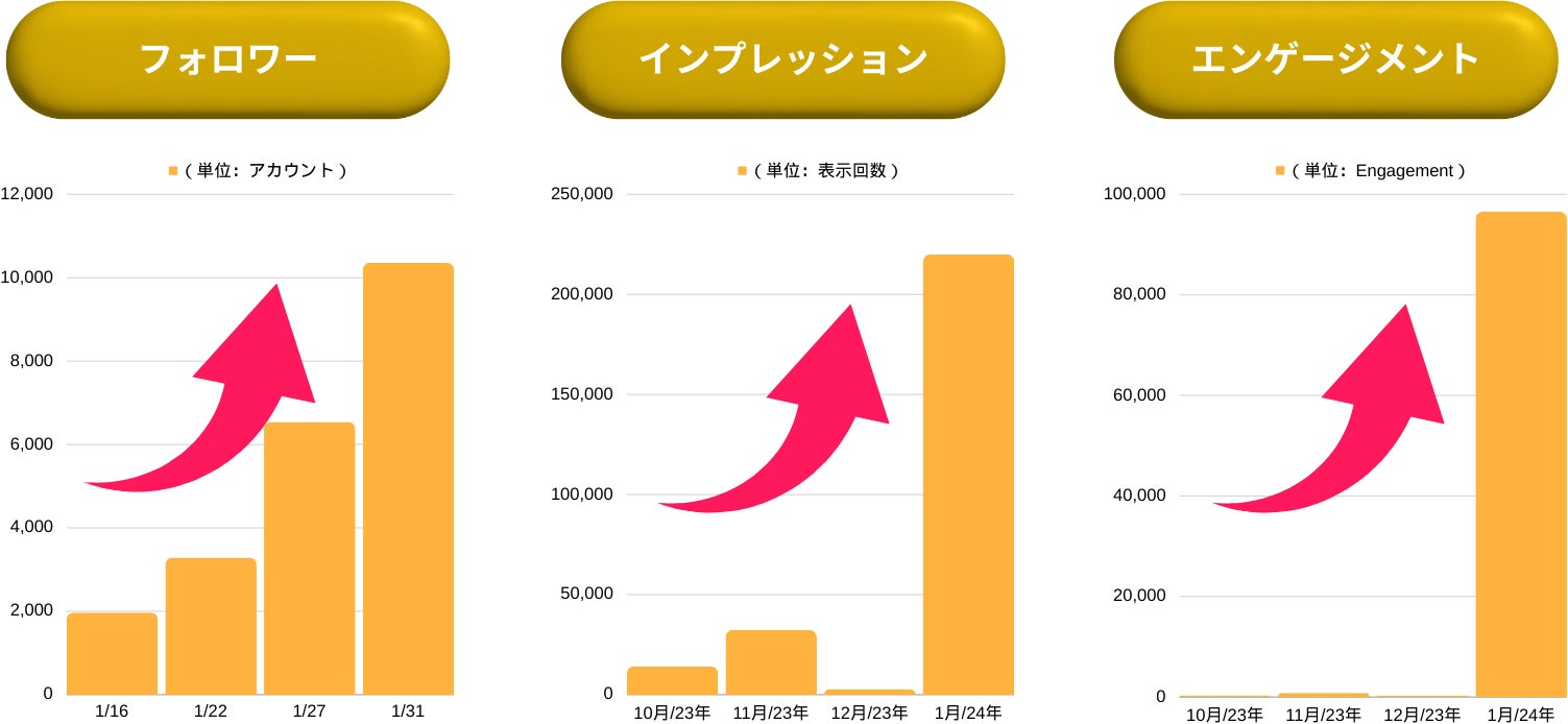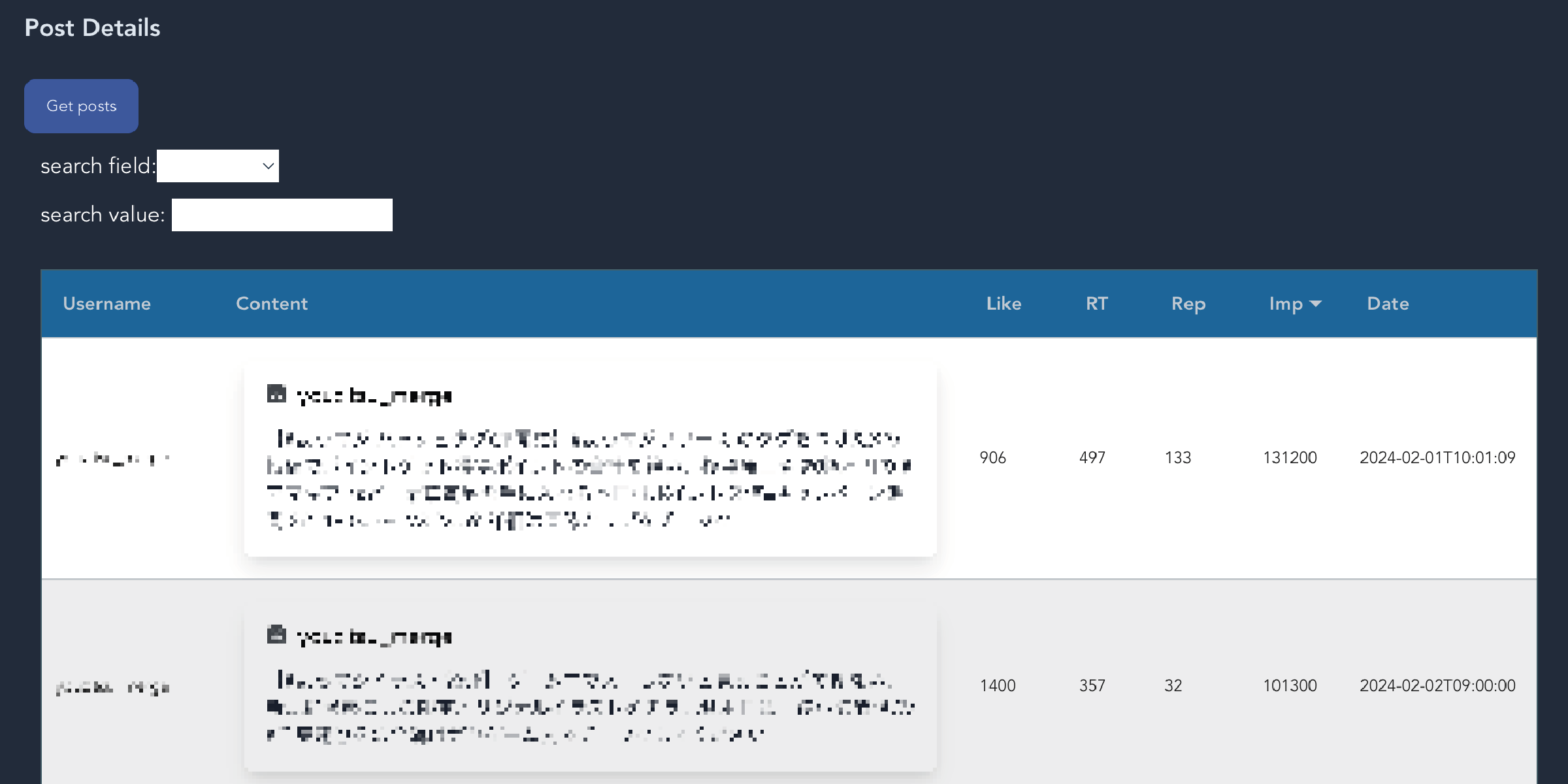 ポストごとのインプレッションと各エンゲージメントを一覧化することで、サービスやプロジェクトの次回の施策検討に活用可能