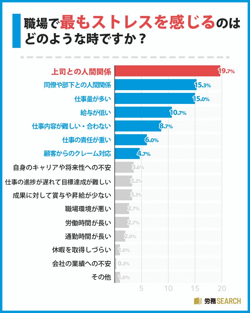 職場で最もストレスを感じる場面については、第1位が「上司との人間関係」で19.7%、第2位が「同僚や部下との人間関係」で15.3%、第3位が「仕事量が多い」で15.0%という結果になりました。