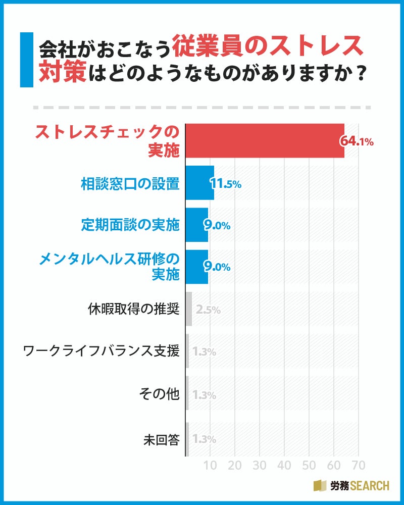 実際にストレスチェックを実施している企業は比較的多いようで、前問で「会社で従業員のストレス対策がおこなわれている」と回答した方に向けて、その対策方法について聞いてみたところ、「ストレスチェックの実施」が64.1%と最も多い結果となりました。