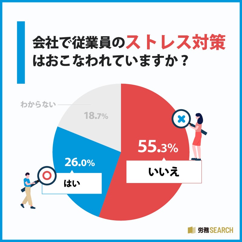 従業員のメンタルヘルスを守るためには、企業は体制整備やコミュニケーションの促進など、多角的なアプローチで対策を進める必要があります。そこで、会社で従業員のストレス対策がおこなわれているか聞いてみたところ、「おこなわれていない」が55.3%、「おこなわれている」が26.0%、「わからない」が18.7%という結果になりました。