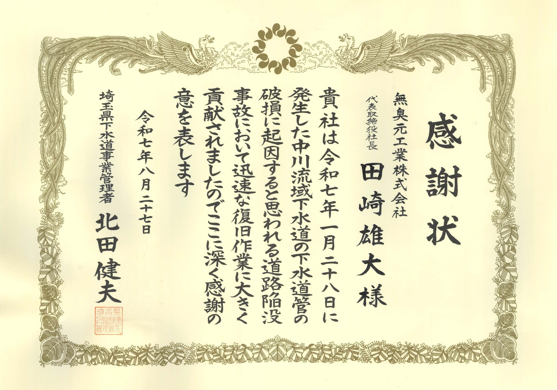 このたび無臭元工業株式会社(本社:東京都足立区、代表取締役社長:田崎雄大)は、2025年1月28日に発生した埼玉県八潮市道路陥没事故における対応協力に関して、埼玉県下水道事業管理者より感謝状を拝受いたしました。