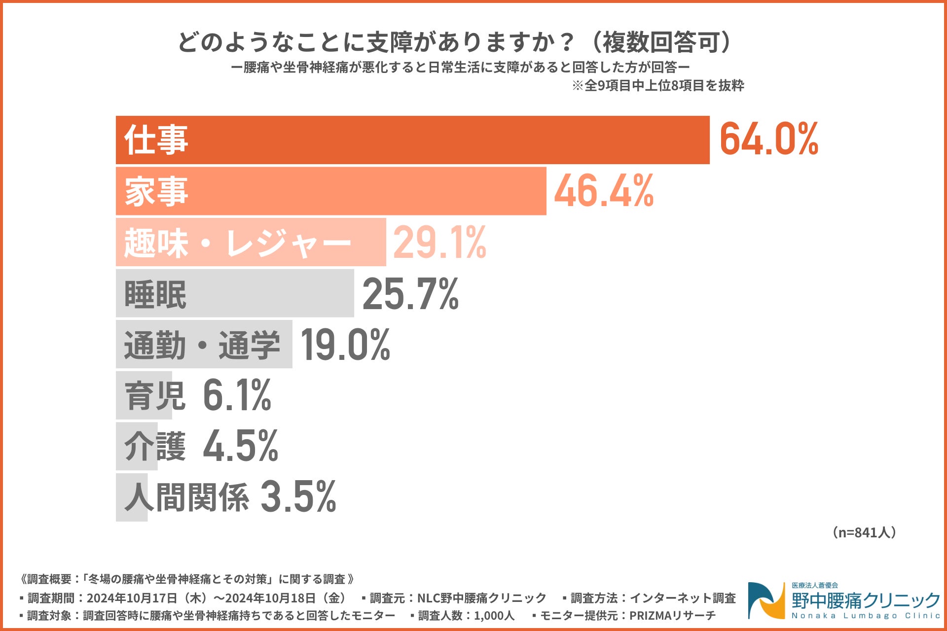 腰痛や坐骨神経痛が悪化することで日常生活に支障があると回答した方に「どのようなことに支障がありますか?(複数回答可)」と質問したところ、『仕事(64.0%)』と回答した方が最も多く、次いで『家事(46.4%)』『趣味・レジャー(29.1%)』となりました。